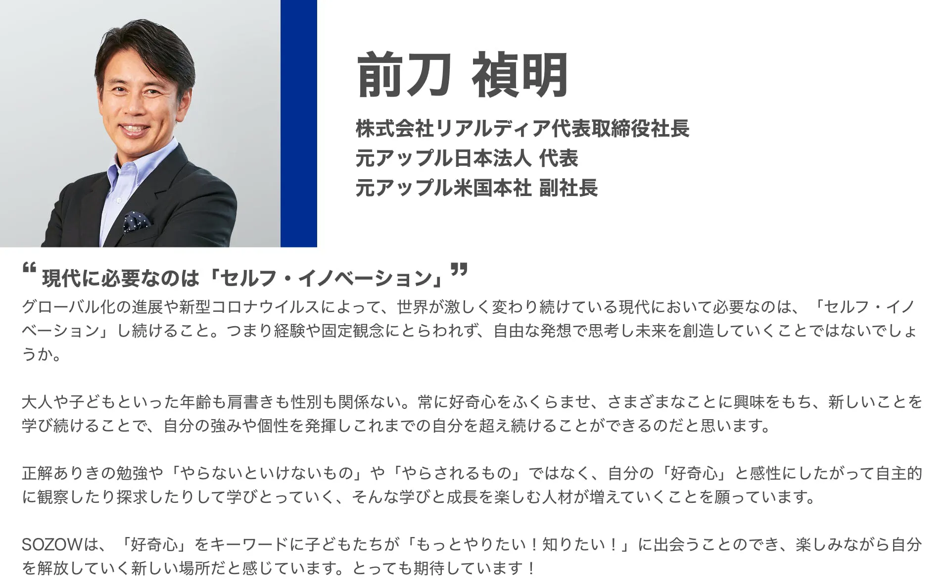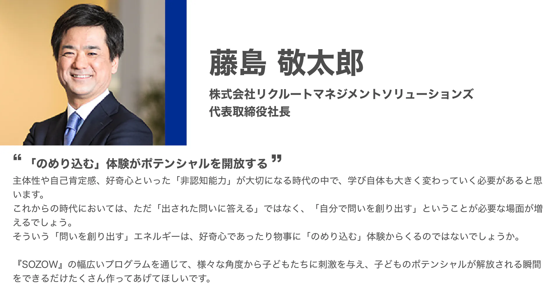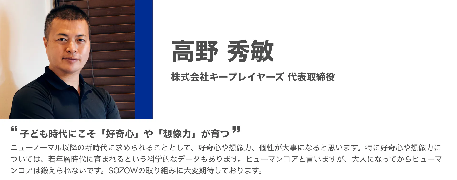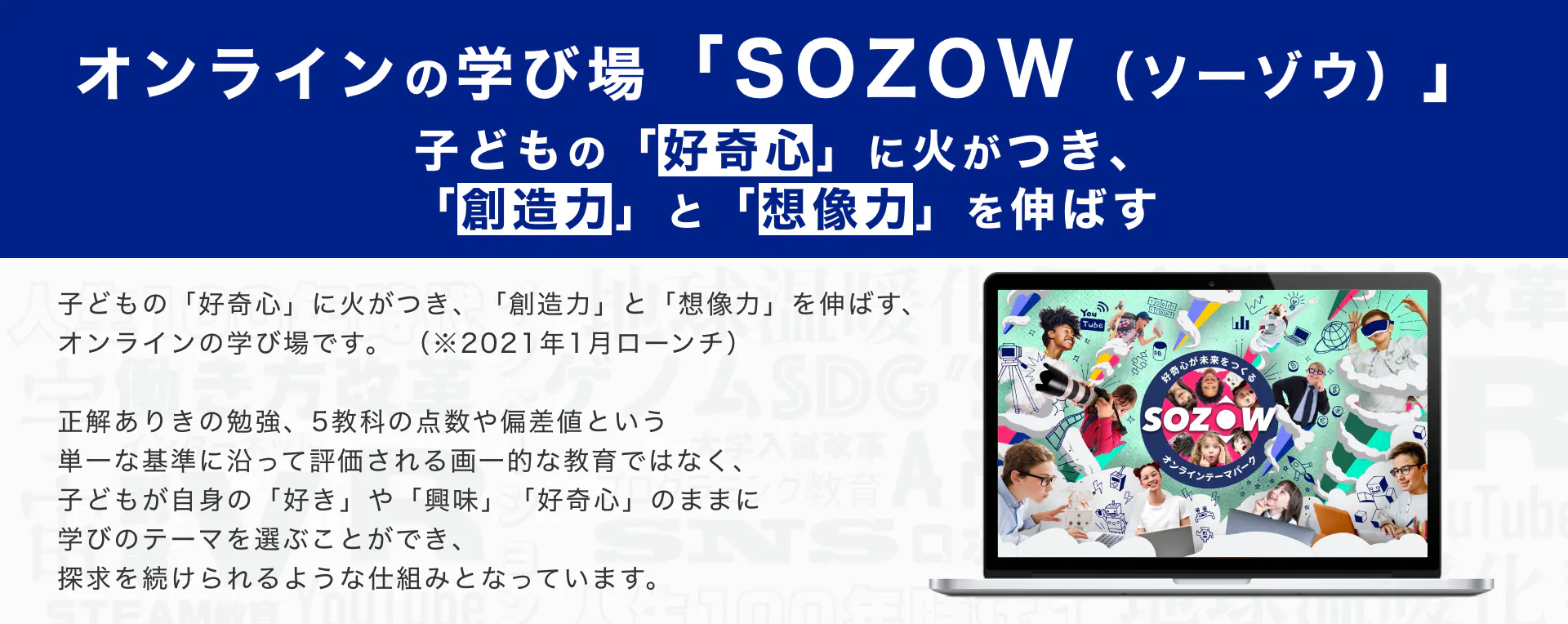 「SOZOW」を通して、子どもひとりひとりが持つ個性に寄り添い、その子ならではの「好き」や「やりたい」を見つけ、育むお手伝いをしていきます。このサービスを一人でも多くの子どもに受けてもらい、自分らしく生きるきっかけを提供したいと考えています。
