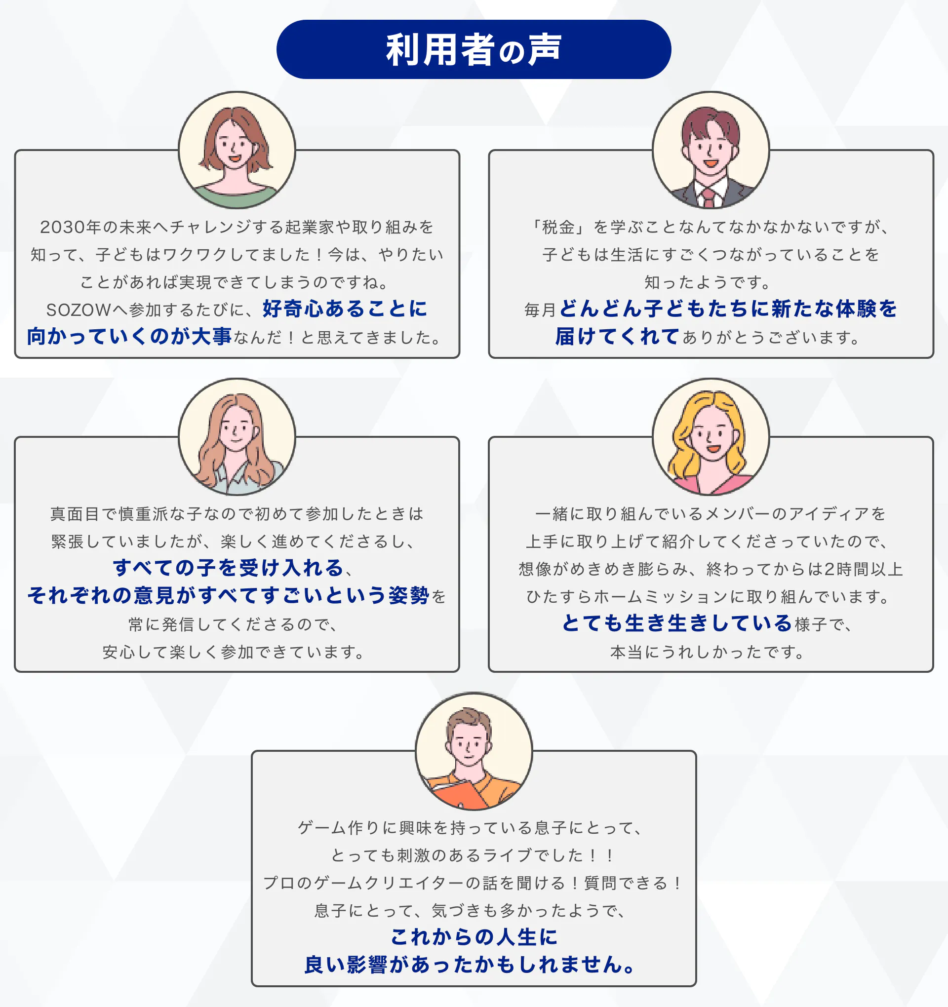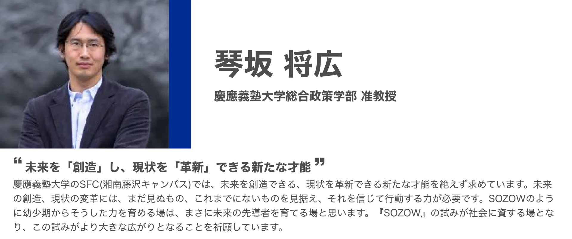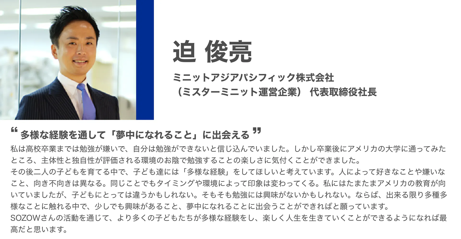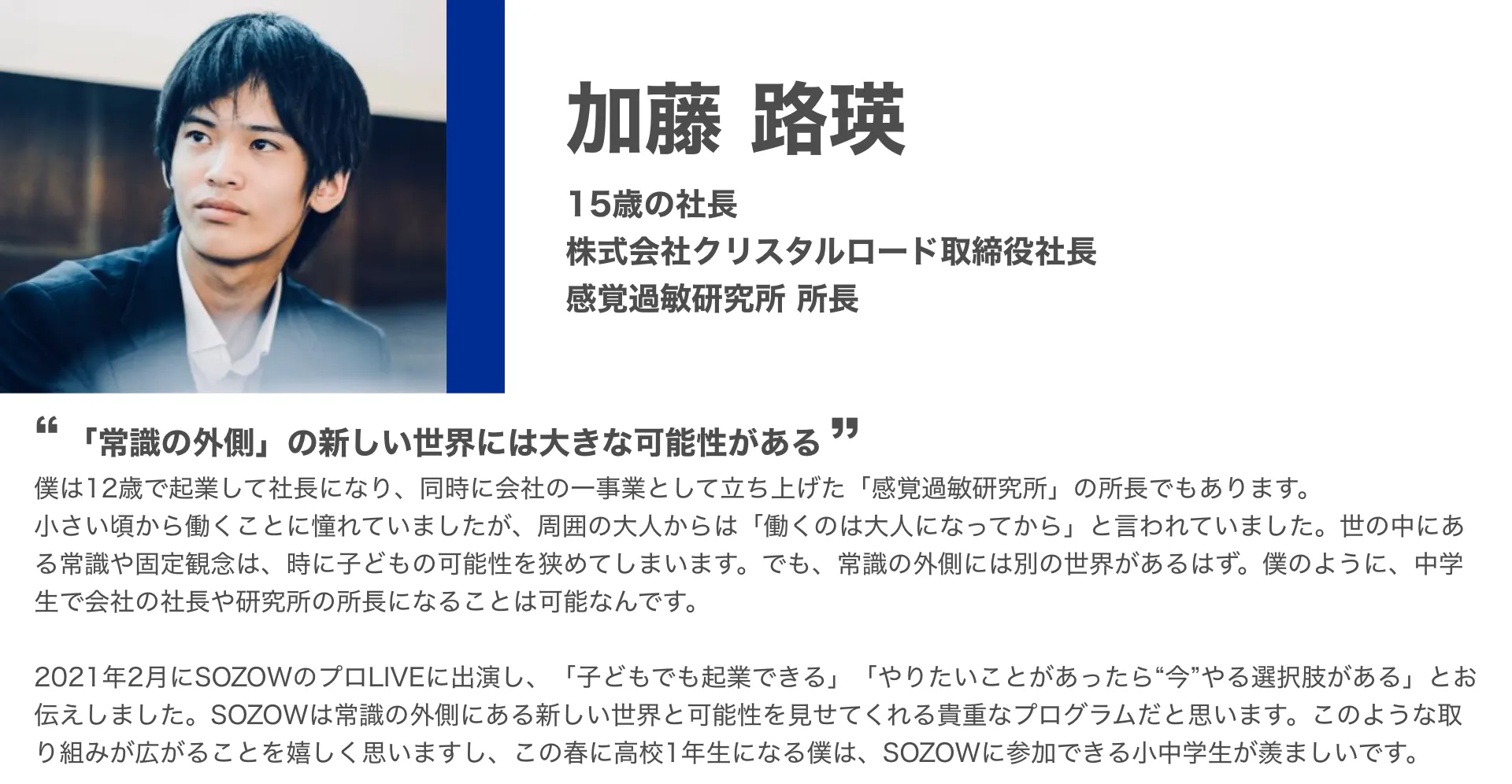 「SOZOW」を通して、子どもひとりひとりが持つ個性に寄り添い、その子ならではの「好き」や「やりたい」を見つけ、育むお手伝いをしていきます。このサービスを一人でも多くの子どもに受けてもらい、自分らしく生きるきっかけを提供したいと考えています。