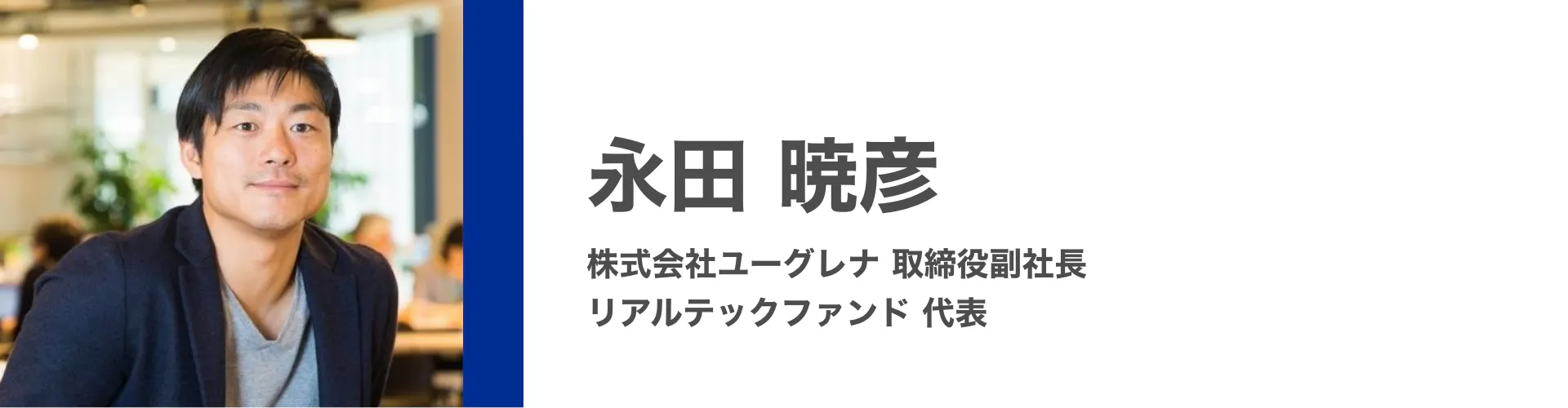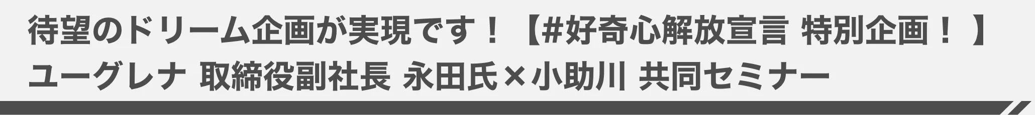 本プロジェクト応援団の一員である、株式会社ユーグレナ 取締役副社長&リアルテックファンド代表の永田氏と、本プロジェクト発起人であり、Go Visions株式会社代表取締役 小助川の共同セミナーです!