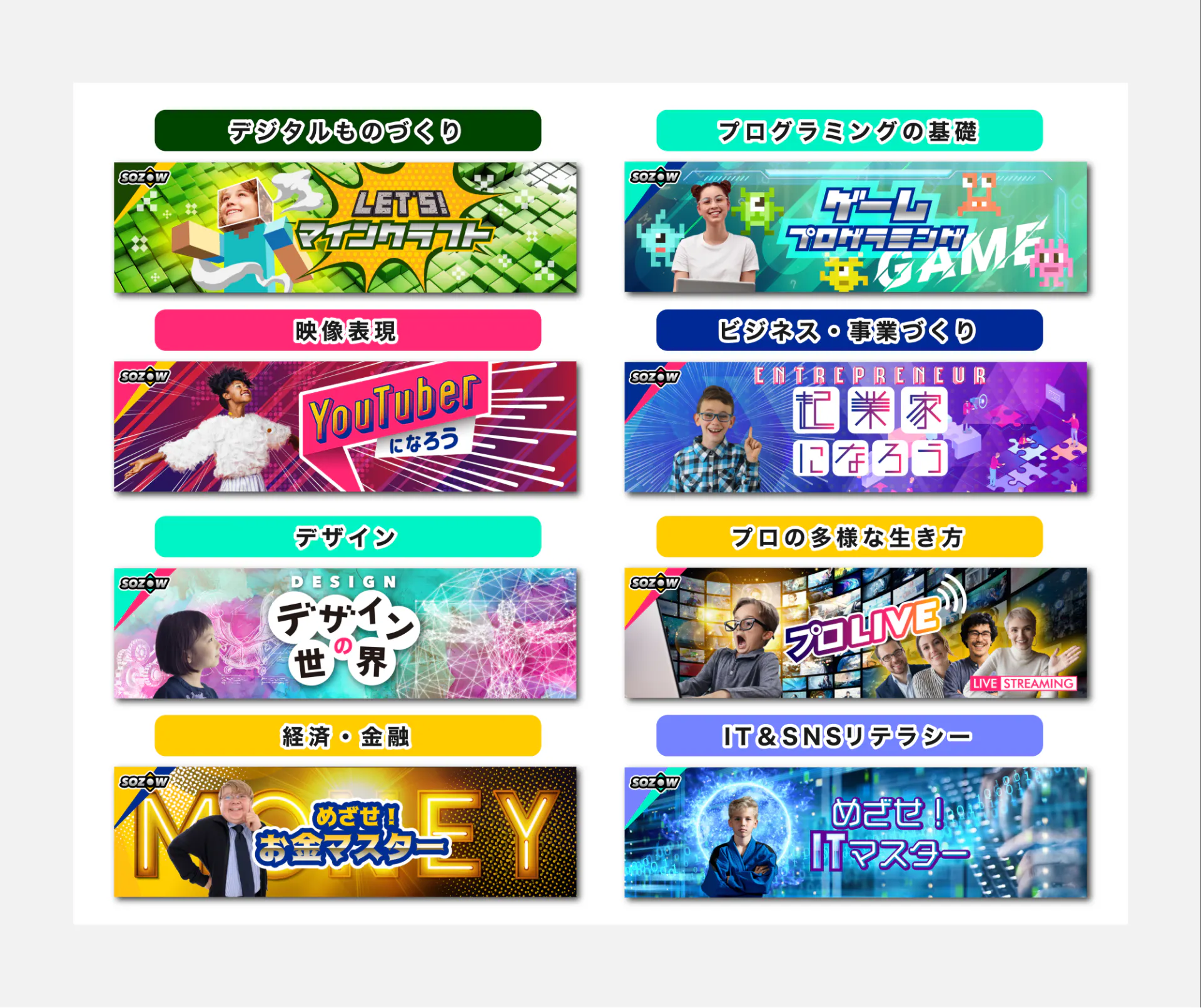 SOZOWで実際に子どもたちが体験しているアクティビティのエッセンスをそのままにお届け。その内容は、ファイナンス、プログラミング、起業、YouTuberなど、新時代を生き抜く力に必要なカリキュラムとなっており、大人でも十分にワクワクできるクオリティとなっております。(※お届けする内容の選定はこちらでさせていただきます)