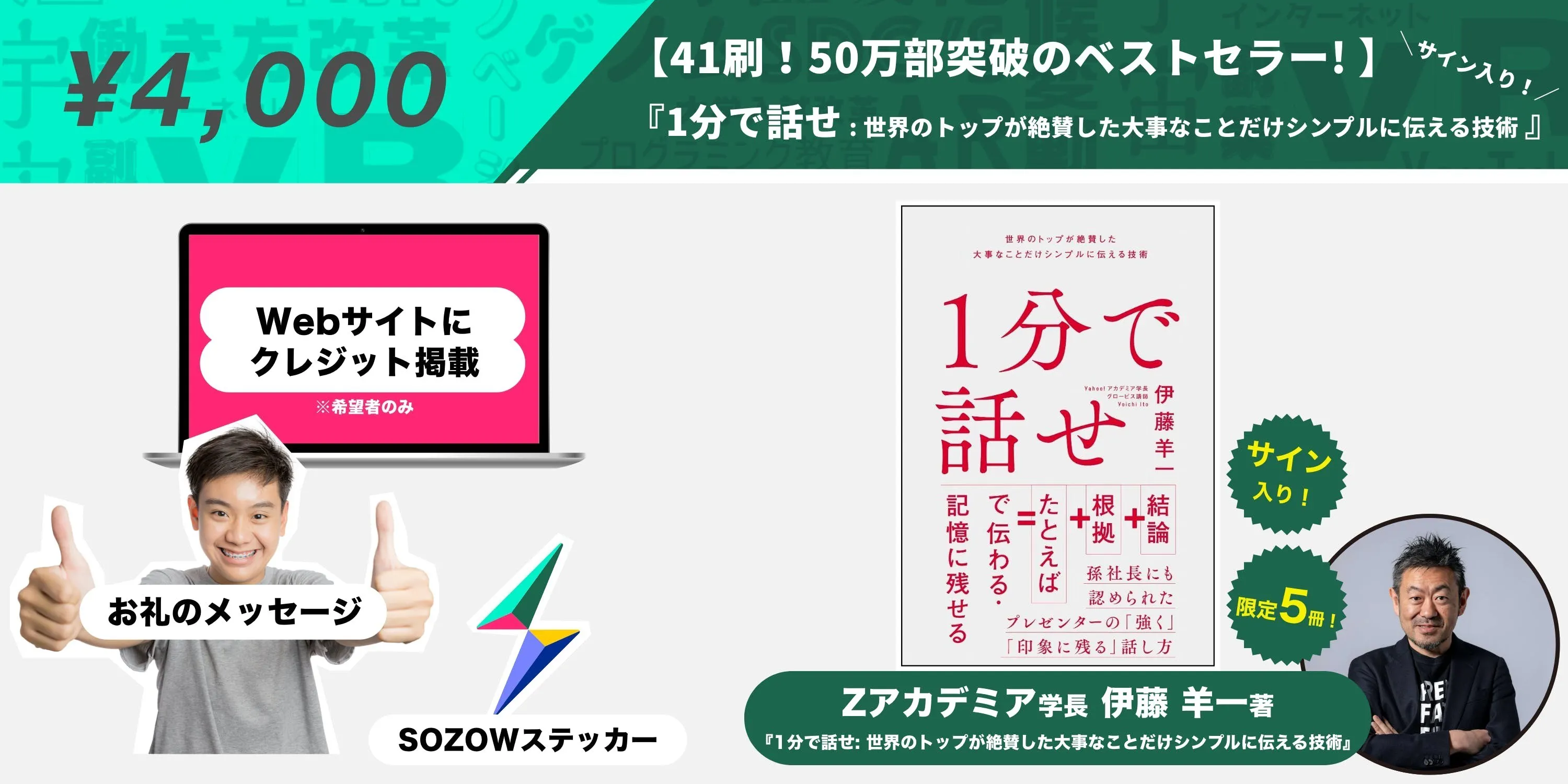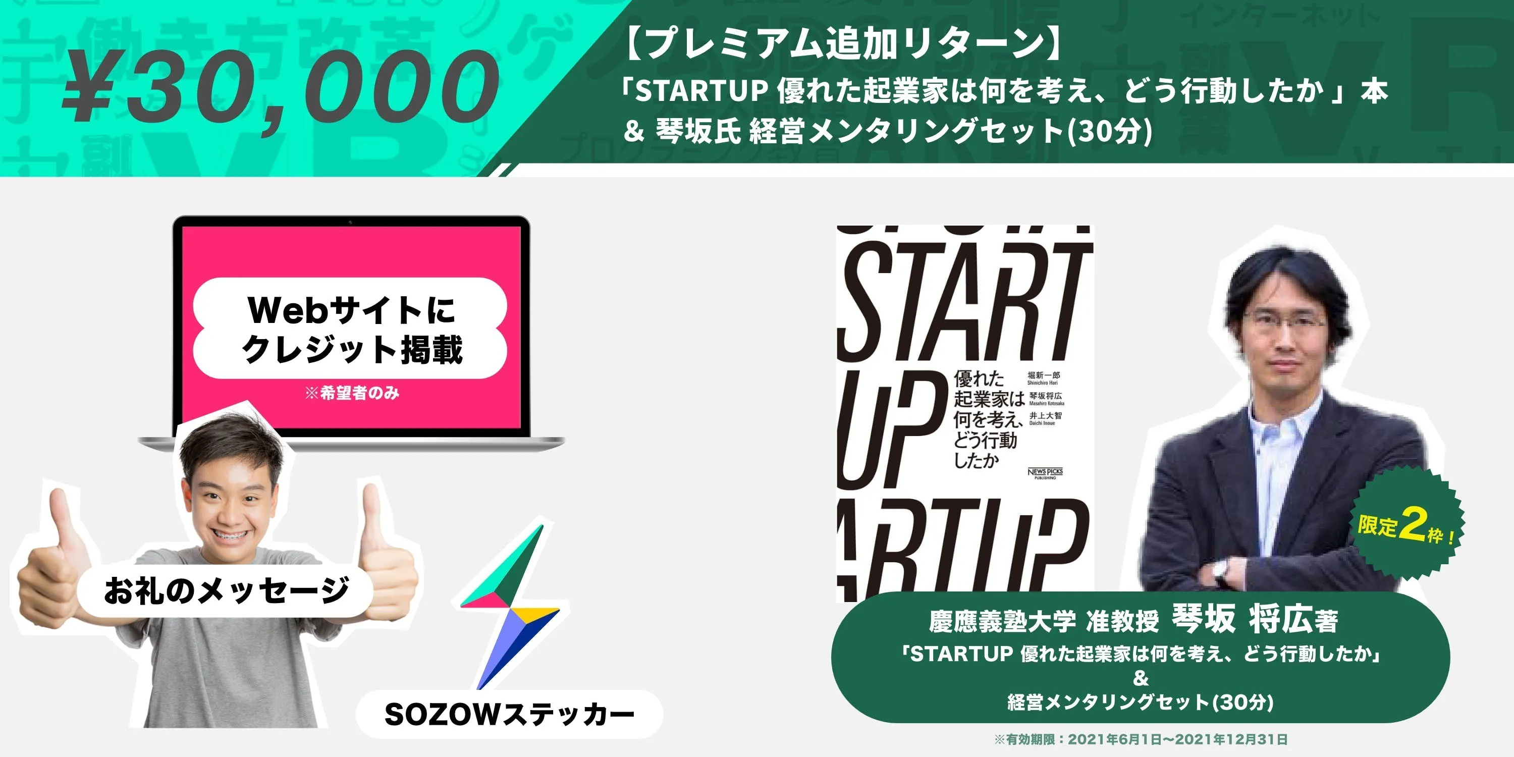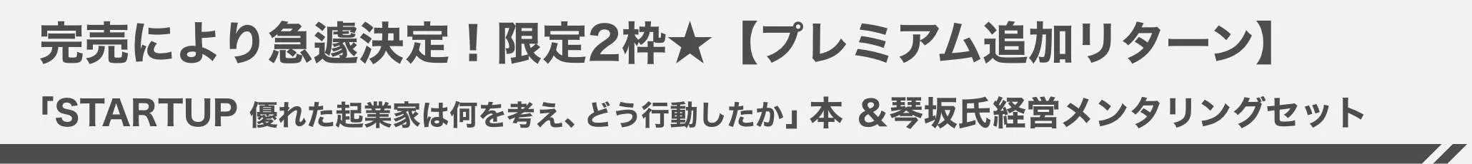 本プロジェクト開始後に即完売(その後10冊限定で追加)となったリターンである琴坂氏の「STARTUP 優れた起業家は何を考え、どう行動したか 」完売への感謝を込め、急遽追加の決まったプレミアムリターンです。「STARTUP 優れた起業家は何を考え、どう行動したか 」と、本人によるメンタリングのセットで限定2枠。クラウドファンディングだからこそ実現できたこの機会、早い者勝ちです!※本はサイン無しとなります。