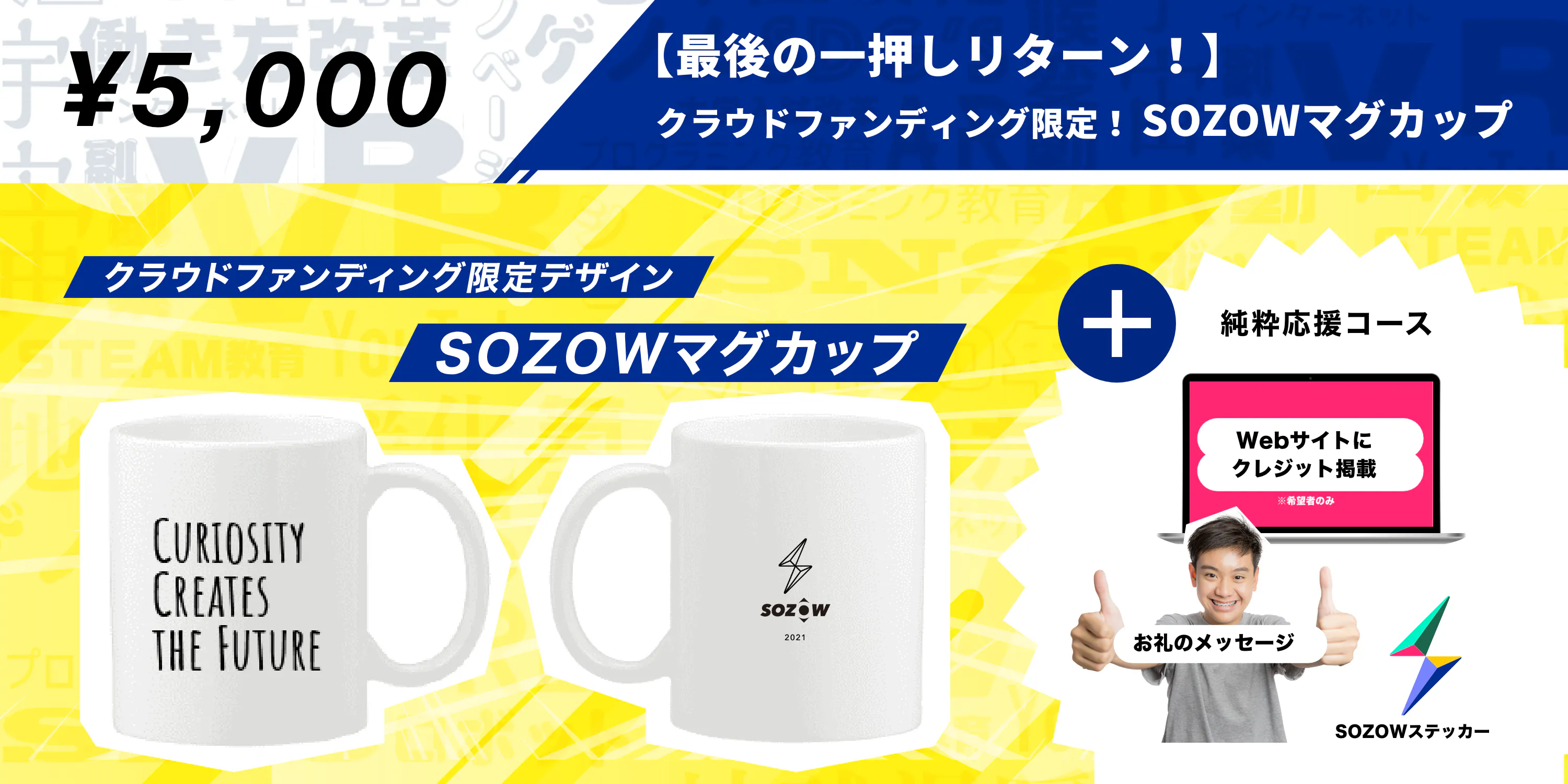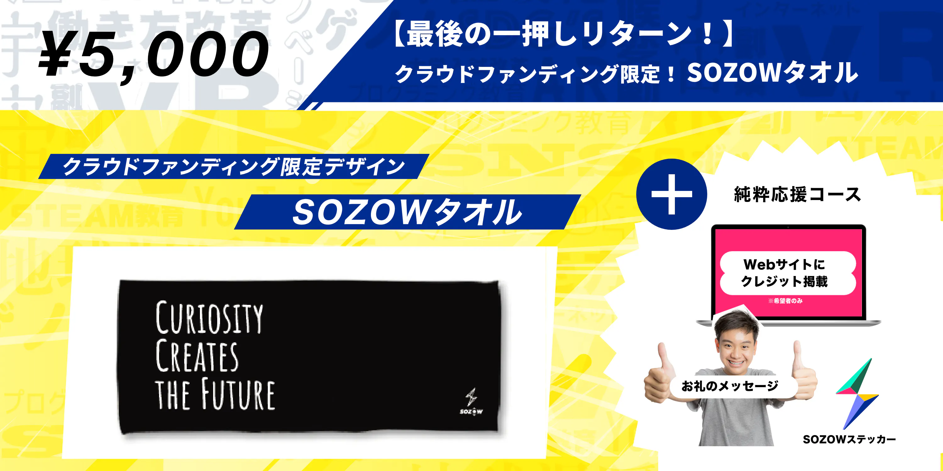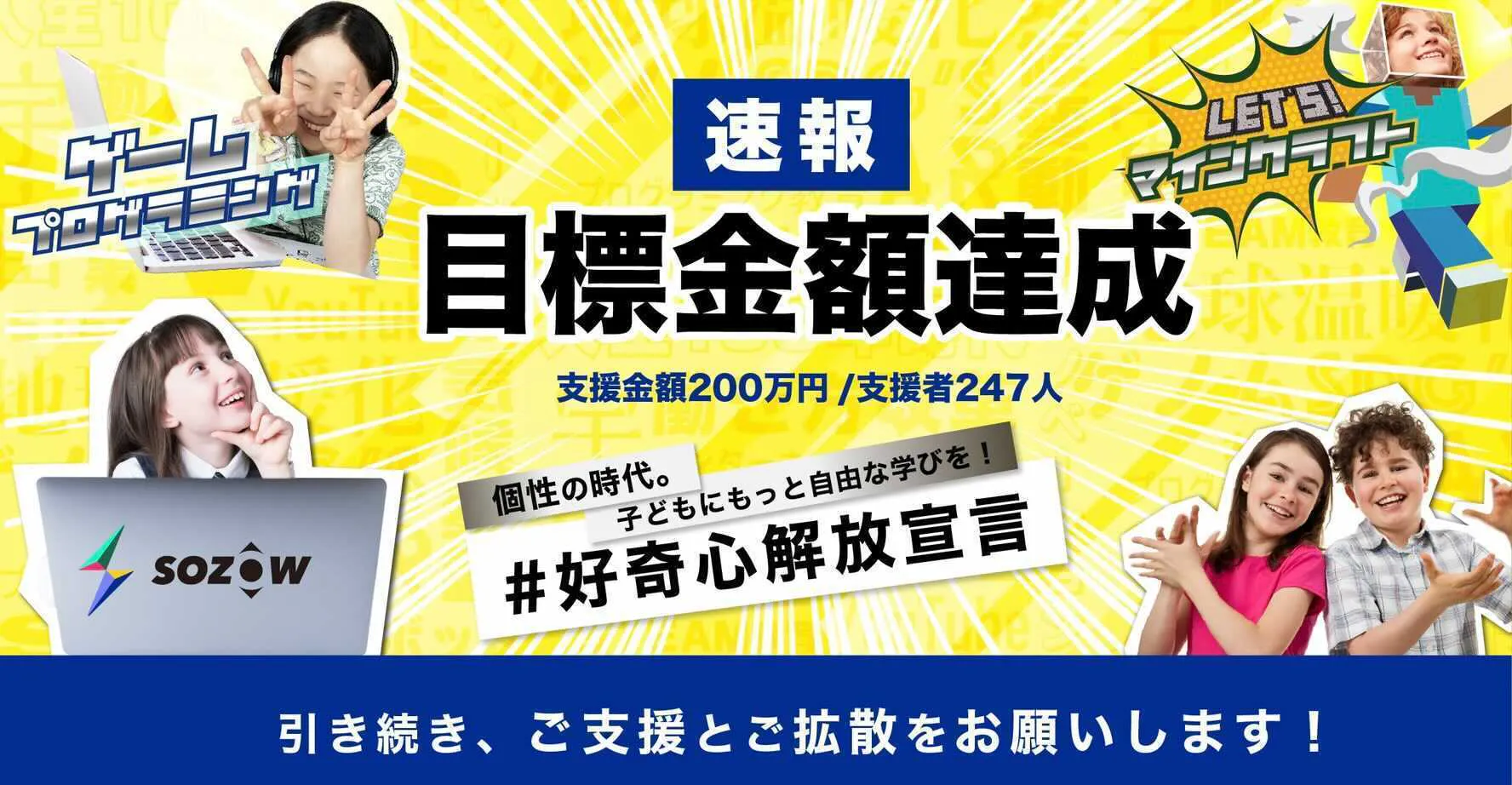 2021/05/16 09:00皆さま、多大なご支援ありがとうございます!SOZOW代表の小助川です。昨日、SOZOWのクラウドファンディングが終了しました。たくさんの応援をいただき、達成することができました。支援者数: 307名支援総額: 2,488,820円 感謝・感謝です。 ありがとうございます!!ご支援額は、以下へ活用させていただきます。①「SOZOW」「異才レポート(仮)」の専門家監修の強化②「SOZOW」「異才レポート(仮)」のユーザー体験改善③「SOZOW」「異才レポート(仮)」のプログラム強化・新規開発これまで以上に、子どもたちが未来につながる新たな学びを届けていきます。SOZOWの目指す学び実は、私たちは元々はリアルな場で、子どもたちにデジタルものづくり体験を届けるイベント事業を手がけていました。そして、コロナの影響を受けて、ちょうど1年前の5月に、オンラインへ事業転換を決意しました。コロナによって、社会変化のスピードが加速する。そして、必ず画一的教育システムの課題が噴出する。社会から求められる教育のあり方が大きく変わると確信。・子どもが主役、個性を伸ばす学びを社会の当たり前にしたい!・オンラインだからこそ、地域関係なく届けたい!そこからは怒涛の事業づくりに突き進みました。そして、2021年1月にSOZOWをスタートしました。すでに全国や海外からもSOZOWに参加してくれている子どもたちがいます。画一的教育へ当てはまらない子どもたちも、多数参加してくれており、初めて友達ができたり、好きなことで自己肯定感を回復しているという事例も出始めました。ただ、まだまだ私たちの目指す目標には1%も達していません。クラウドファンディングを行ったのは、まだまだ可能性を否定されたり、個性を潰されそうな環境にいる子どもたち、コロナで激増する不登校などの課題があり、もっと多くの皆さんからチカラを借りたい! チカラを借りなければ、到達が遅れてしまう!という考えがあったためです。これだけの多数のご支援、本当にありがとうございます。ご支援を元に、より事業を前進していきます!3ヶ月後・半年後・1年後、さらにSOZOWは進化を遂げ、多くの子供たちに新たな学びの機会を届けます。必ず!それが皆さんのご支援に応える一番の方法だと考えているからです。今後とも、どうぞSOZOWをよろしくお願いします。Go Visions株式会社 小助川 将(コッシー) もっと見る