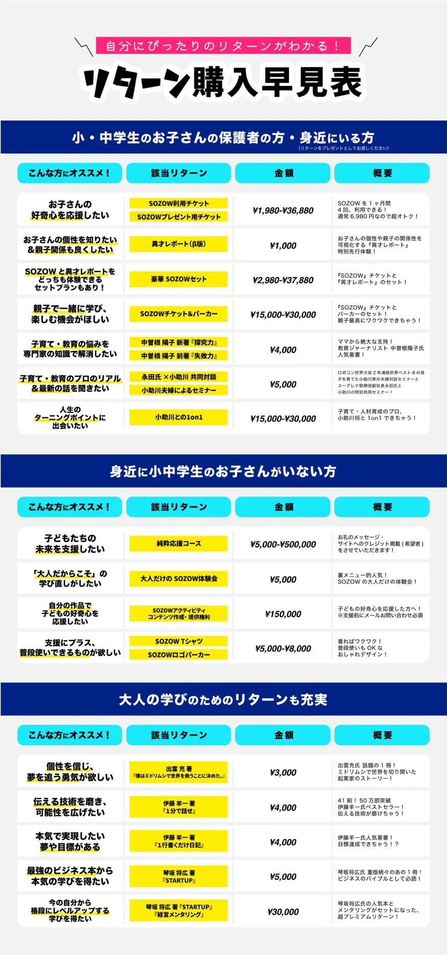 本クラウドファンディングにつきまして、ただご支援いただくのではなく、ご支援者様に合ったリターンをお選びいただき、ご満足していただきたいという思いから、リターンの一覧表をご用意いたしました。表を参考に、ぜひ、ご自分に合ったリターン選びをお楽しみいただければと思います。