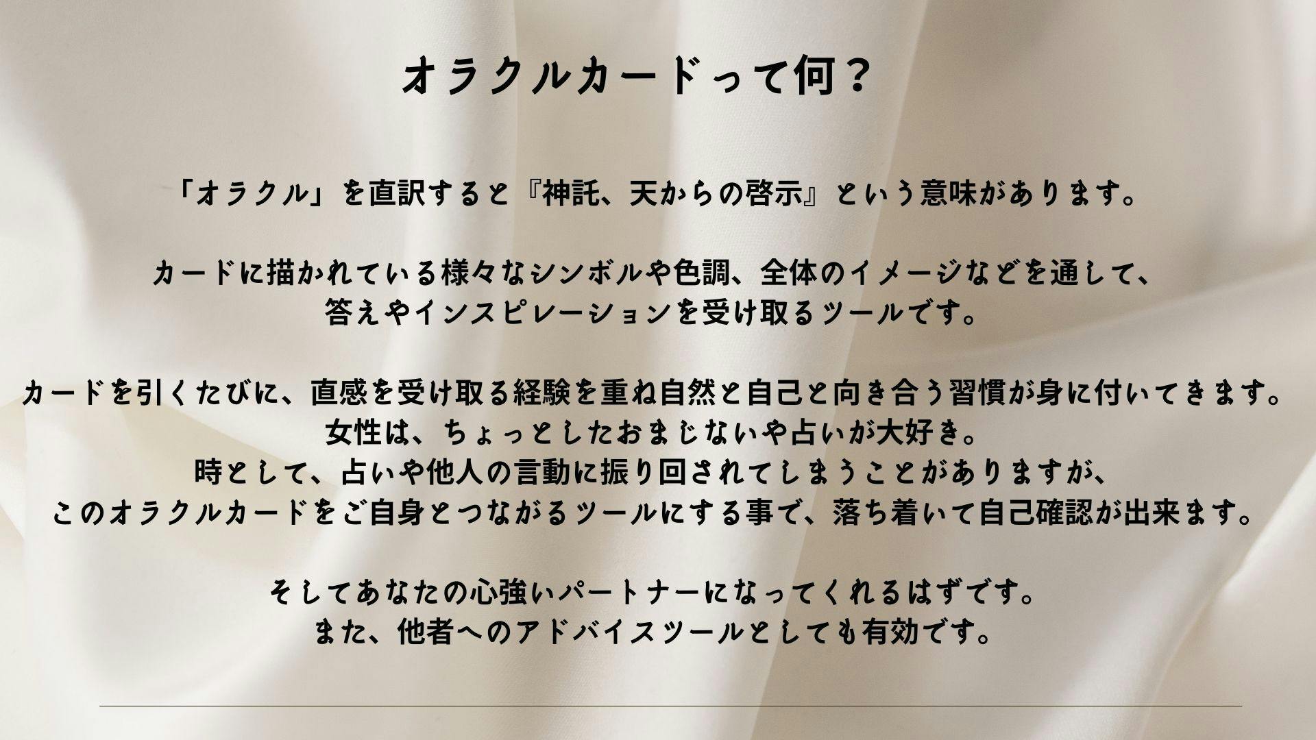 大切な1日の始まりや終わりに「今日はどんな日 ?  今日の私どうだった ?」などと話しかけるようにカードに聞いてみてくださいね。すぐに仲良くなって受け取るメッセージが溢れ出してくるようになります。