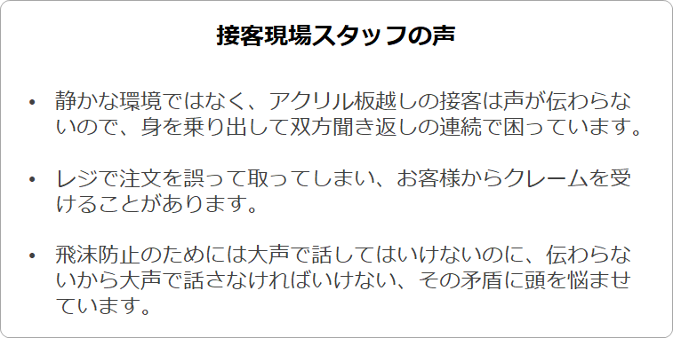 新型コロナウイルスの蔓延で、スーパーのレジや病院の受付等様々な場所で感染防止のビニールシートやアクリル板が人々を仕切り、マスクを着用して会話をすることが当たり前の光景となりました。お客様と接客スタッフの安全と引き換えに、お互いの声が「聞き取りづらい」ストレスが日常的に増えています。