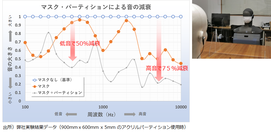 実験によっても、マスクやパーティションによって音が遮られて音量が大きく減衰していることが確認されました。子音の聞こえに影響を及ぼす高音領域だけでなく、母音の聞こえに影響をおよぼす低音領域でも音量が減衰しています。これは静かな部屋での実験ですが、周囲の騒音もある環境では音量の減衰は聞こえに大きな影響を与えます。