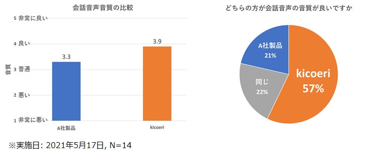 5段階評価で得点付けすると、kicoeri=3.9(良い)、A社製品=3.3(普通)となりました。両者の音声を聞き比べてみるとkicoeriの方が音質が優れていると回答した人は57%で、A社の21%を大きく上回りました。