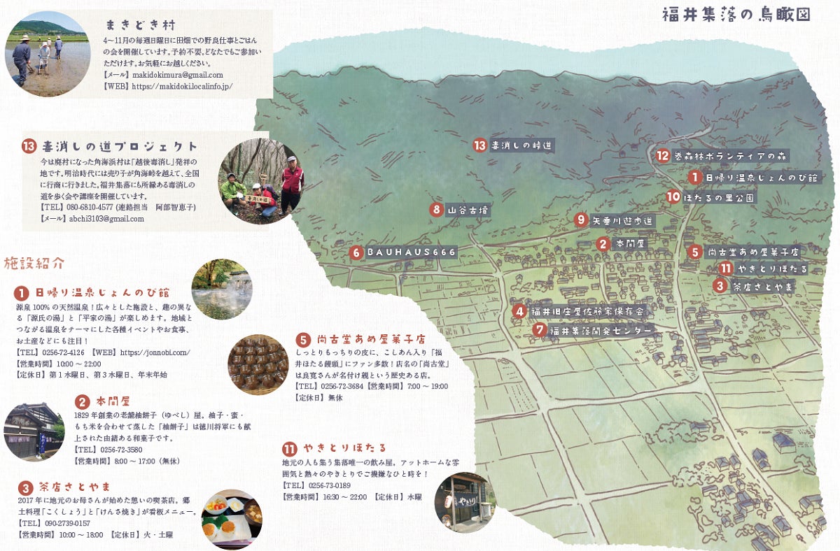 週末に農作業や昔暮らしを楽しもうという「まきどき村」や、今は廃村になった角海村にいた「越後毒消し売り」の歴史文化や歩いた道を守り伝えようと活動する「毒消しの道プロジェクト」といったグループです。