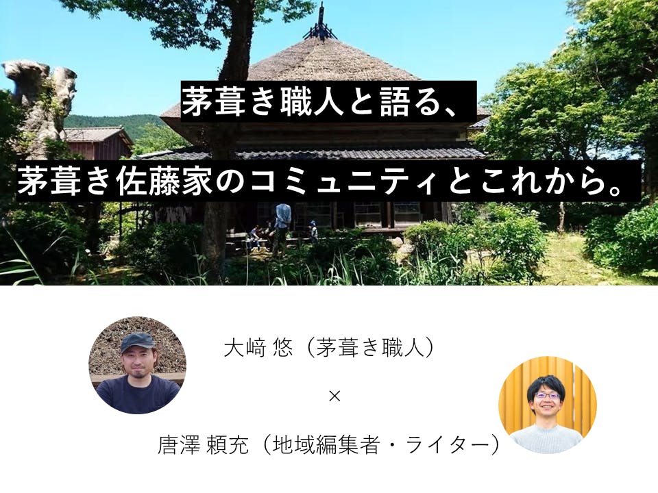 2022/04/01 16:11本日、19時より茅葺き職人の大﨑悠さんをお招きし、 「茅葺き職人と語る、茅葺き佐藤家のコミュニティとこれから」 と題した配信イベントを実施します。以下URLのYou Tubeライブで配信予定です。 アーカイブも残す予定ですのでぜひご覧いただければ幸いです。 配信URL:https://youtu.be/88frdnoncGc【イベント詳細】 茅葺き職人と語る、茅葺き佐藤家のコミュニティとこれから2022年春、 新潟県新潟市西蒲区福井集落にある茅葺き屋根の古民家佐藤家の茅葺屋根の葺替え工事が行われています。 多くの方々から寄付によって、2018年から着手した屋根工事もこれで一段落。総額で1,000万円近くの費用をかけ、この古民家をまた少し先の未来まで残すことができそうです。 佐藤家は、村に残された最後の茅葺き建物が取り壊されることを聞き「茅葺とともに、この土地で受け継がれてきた暮らしや文化もなくなってしまう」と危機感を抱いた地元有志が1998年から保存活動を始めました。 あれから22年。佐藤家には、多くの人たちが訪れ、コミュニティが生まれてきました。そしてこの家を少しでも未来に残したいと願う多くの人たちの寄付やボランティアにより、屋根の葺き替えや建物の修繕を続け、古民家を象徴として、この地域に残る文化を体験できる場を提供してきました。古い建物が、世の中からますます姿を消す中、こうした建築物を残すとこの意義は何なのか? また、佐藤家のようにコミュニティが息づく古民家の未来はどうなるのか? 新潟県で活躍する若手茅葺き職人・茅葺いけがみの大﨑悠さんと共にお酒を片手に語らいます。 【登壇者】 唐澤頼充(地域編集者・ライター/NPO法人福井旧庄屋佐藤家保存会 理事) https://lit.link/karasawa07大﨑悠(茅葺き職人/茅葺いけがみ 代表) https://kaya-ikegami.com/福井旧庄屋佐藤家 https://syoyasatoke.localinfo.jp/写真集のお買い求めはコチラ https://karasawa.thebase.in/配信URL:https://youtu.be/88frdnoncGc もっと見る