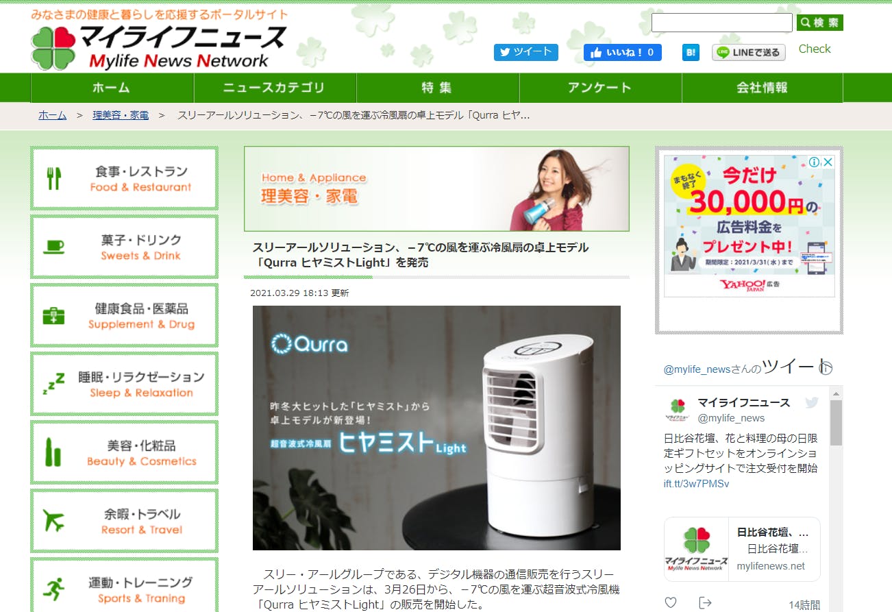 「マイライフニュース」で紹介されました!冷風扇「ヒヤミストLight」