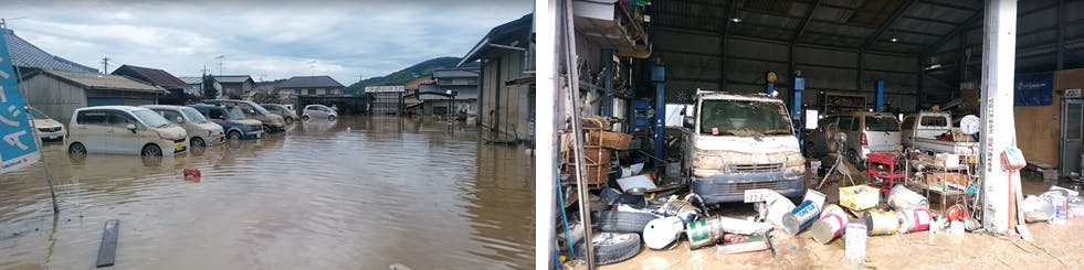 事業所及び自宅ともに約3.5mの浸水被害により全壊となり当店在庫車両や営業車など約40台が水没。