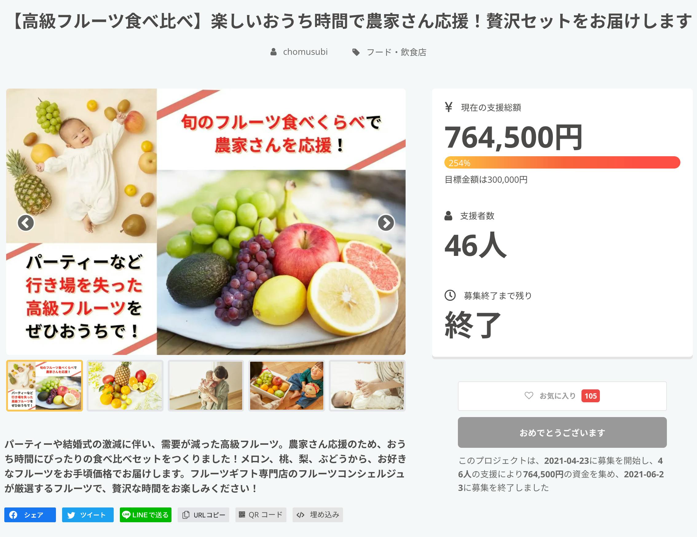 2021/06/23 10:11こんにちは。蝶結び代表の杉下です。今回のプロジェクトは本日6月23日23:59をもって終了となります!昨日今日とご支援、お気に入り登録いただいた方誠にありがとうございます。それぞれ旬の美味しい時期にお届けさせていただきますのでしばらくお待ちください。シルバーセット、ゴールドセットをご支援いただいた方にはプロジェクト終了後すぐにご連絡を差し上げます。6月末には第一回目のリターン品をお届けさせていただきます。CAMPFIREアカデミーに登壇先日CAMPFIREさんにお声がけをいただきCAMPFIREアカデミー(※)に登壇させていただきフルーツギフト専門店「蝶結び」https://retrospect.co.jp/のことや今回のクラウドファンディングに挑戦するに至った経緯などお話をさせていただきました。※CAMPFIREアカデミーは、クラウドファンディングのノウハウを、無料で学べるサービスで、クラウドファンディングに興味はあるけどはじめの一歩がなかなか踏み出せない方や、実際の事例からどんなことを実施しているのかなどセミナーを通して学べます。https://academy.camp-fire.jp/セミナー内で使用したスライド一例多くの方にご支援いただいた今回の取り組みについて、これからクラウドファンディングに挑戦される方に少しでもお役に立てればとお話しさせていただきました。僕自身、創業時思い描いていたこと、事業に対する姿勢など忘れかけていたことを思い返すことができ、非常に良い機会をいただいたと感謝しております。ありがとうございました。フルバージョンの動画はこちらhttps://www.youtube.com/watch?v=e1X8T1Do_pY今回のリターン品は贈り物にもご利用いただけます同じフルーツでも品種が違えば、味も見た目も全く別のものになます。同じフルーツでも品種が違うとこんなに味が違うんだ!と実感していただけると思います。ぜひお気に入りの品種を見つけてください!僕たち蝶結びは、ギフトを専門に扱うブランドです。今回のクラウドファンディングでは、ギフトも可能です!リターン品は7月から9月に贈り物として人気のフルーツばかりです。ぶどうや桃、梨は好き嫌いが少なく、お子さまから年配の方まで楽しんでいただける万人向きのフルーツでもあります。ご希望の方は、配送先に贈り先、備考欄に送り主情報(お名前・住所・電話番号)をお申込みの際に必ずご入力ください。熨斗やラッピングも承りますので、ご希望の場合は備考欄にご記載ください。フルーツギフトのことなんでも以下からご相談いただけます。ぜひ気になったこと、好きな品種など教えてください!今日最終日はすぐにお返事できる体制でお待ちしております!蝶結び公式LINEはこちら今回のプロジェクトは本日6月23日23:59をもって終了となります!今回のプロジェクトは本日で終了となりますが、これからも「フルーツ」や「ギフト」を通して心を込めて栽培されている生産者の皆様と、フルーツをご自身や誰かに贈るギフトとしてご利用いただくお客様とのご縁を繋ぐお手伝いをこれからもさせていただく所存です。今後ともよろしくお願いします。プロジェクト終了後にあたらめて御礼の活動報告をさせていただきます。 もっと見る