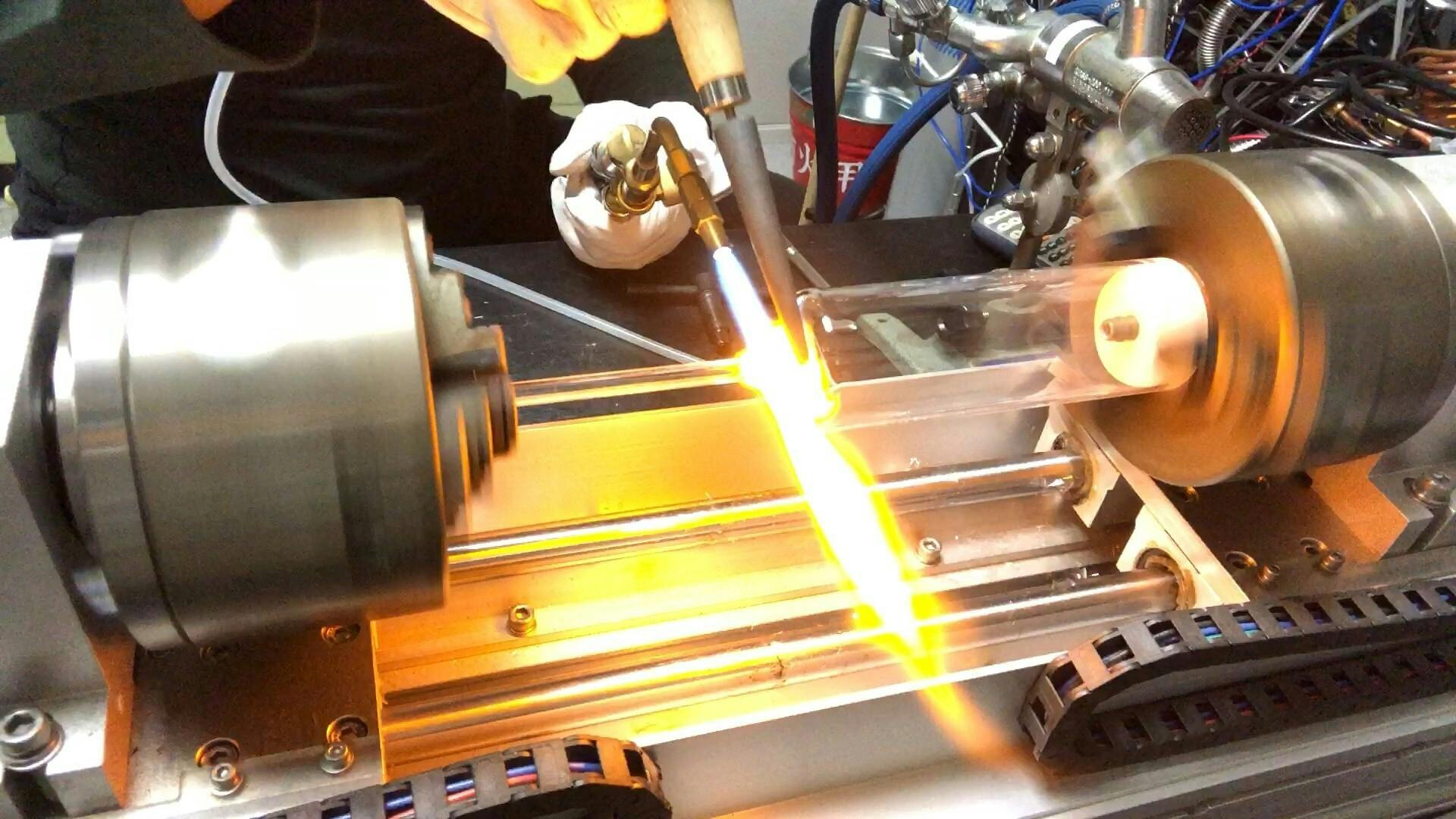 ガラス管の母材から必要な長さを切り出して、ニキシー管の形状に加工します。