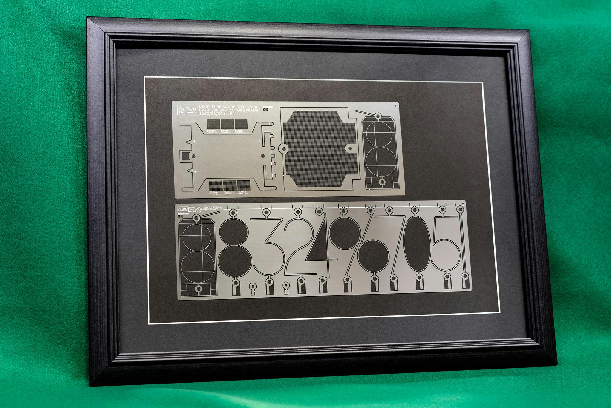 ニキシー管電極のエッチングパーツを額縁に入れてお届け
