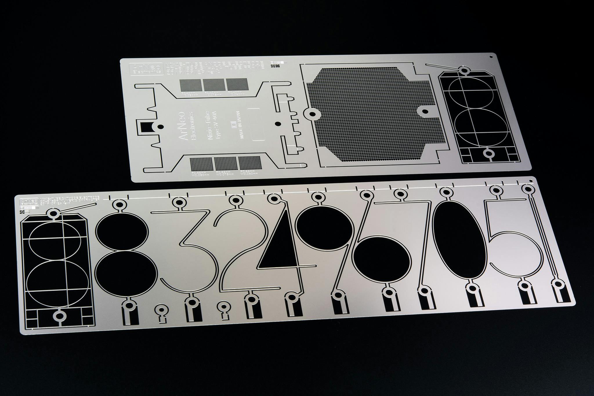 非常に緻密で繊細なニキシー管のエッチングパーツを額縁(フォトフレーム)に入れて鑑賞できるようにしました。お届けするものは実際の製造で使用する本物のエッチングパーツです。材質は0.1mmから0.2mmの薄いステンレス板で、手に持っただけで紙のように垂れ下がり簡単に曲がってしまいます。額縁に入れることで曲がらず、いつでも美しい姿を眺めることができます。レーザー刻印なしの方は、ニキシー管の背面にあたる箇所が無地のままになります。(ロゴや型番なども刻印されません)