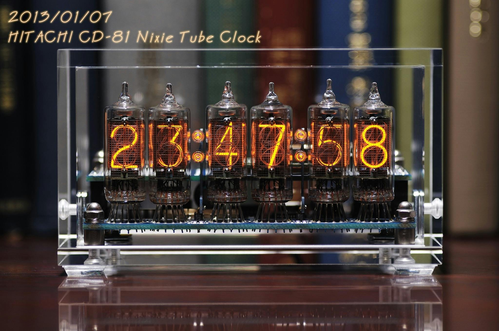 1本のニキシー管の中に0から9まで、10枚の金属板を入れることで1ケタの数字として取り扱うことができます。オレンジ色に光っていますが金属板が発熱しているわけではなく、ネオンガスが放電現象によって光っているので意外なほど消費電力は大きくなく発熱もありません。基本的にガラスの物理的破損以外にほとんど劣化するところがなく、市販されていたニキシー管は正しい使用方法で連続10年以上の稼働実績があります。