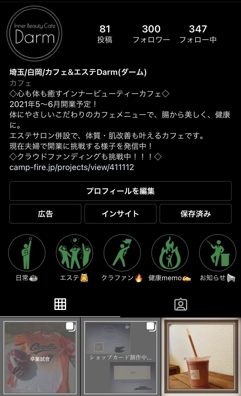 2021/04/14 03:02〜いつも応援してくださってる皆様〜1月22日に夫婦共同Instagramアカウントを作ってから、約2.5ヶ月でフォロワーが300人となりました。いつもご覧になってくれたり、いいねしていただき、本当にありがとうございます★☆★☆アカウント画像も少しリニューアル致しました!インスタグラムを通じて本当に新しい出会いがありました。カフェを経営している方や応援してくださる方…こうやってカフェを開業する前から見ていただく事により、カフェDarmは皆様に支えられています!なかなか進展しない時期もありましたが、これからは物件の契約〜内装工事着工など本格的に始動していきます!ここからがスタート。さらに気を引き締めてやり抜きます!!!フォロワーの皆様本当にいつもありがとうございます+.:゚☆゚:.+.:゚☆゚:.+.:゚☆゚:.+ 今後ともよろしくお願いします。※クラウドファンディングも引き続き継続中です。遠方の方でも白岡市の方でもそれ以外の方でもリターンたくさんお選び頂けます。 もっと見る