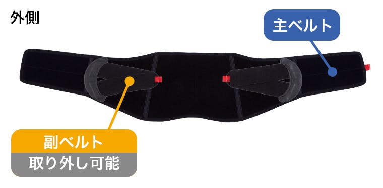 主ベルト:後ろ締め、前締めのどちらの装着時にも腰まわりをしっかりと支えます。