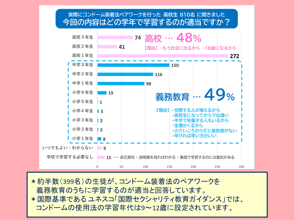 コンドームは性感染症予防や避妊に有効なアイテムです。それでも、まだまだ教育の現場では性にまつわる情報がタブー視され、生徒たちにも先生たちにも偏見や先入観があります。しかし、皆さんもご存じの通り、コンドームは単なるゴム製品であり、マスクと同じ衛生用品です。正しい情報を伝え、使い方を学習すれば、生徒たちは自分の身体への関心を深めながら様々なシュミレーションをしてくれます。