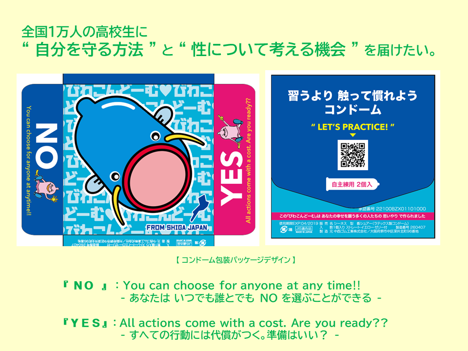今回制作する「びわこんどーむ」の生徒配布パッケージにはコンドームが2個入っています。ひとつは自主練用です。本番からいきなり使うのではなくて、まずは自分の手で触って、どんな物なのか知ってほしいという思いからきています。男子が本番を想定して自主練するのはもちろんですが、女子でも自分の指にかぶせてみたり、ペアでお互いの指にかぶせてみたり、 伸ばしてみたり、ふくらましてみたり、破ってみたりして、まずは構造を理解して欲しいと思います。「習うより、触って慣れよう、コンドーム」です。