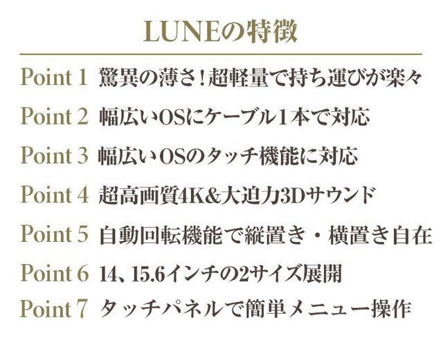 【LUNE(ルーン)】はMacOSをはじめ幅広いOSに対応した、タッチペン対応の非常に新しい4K高画質モバイルディスプレイです。