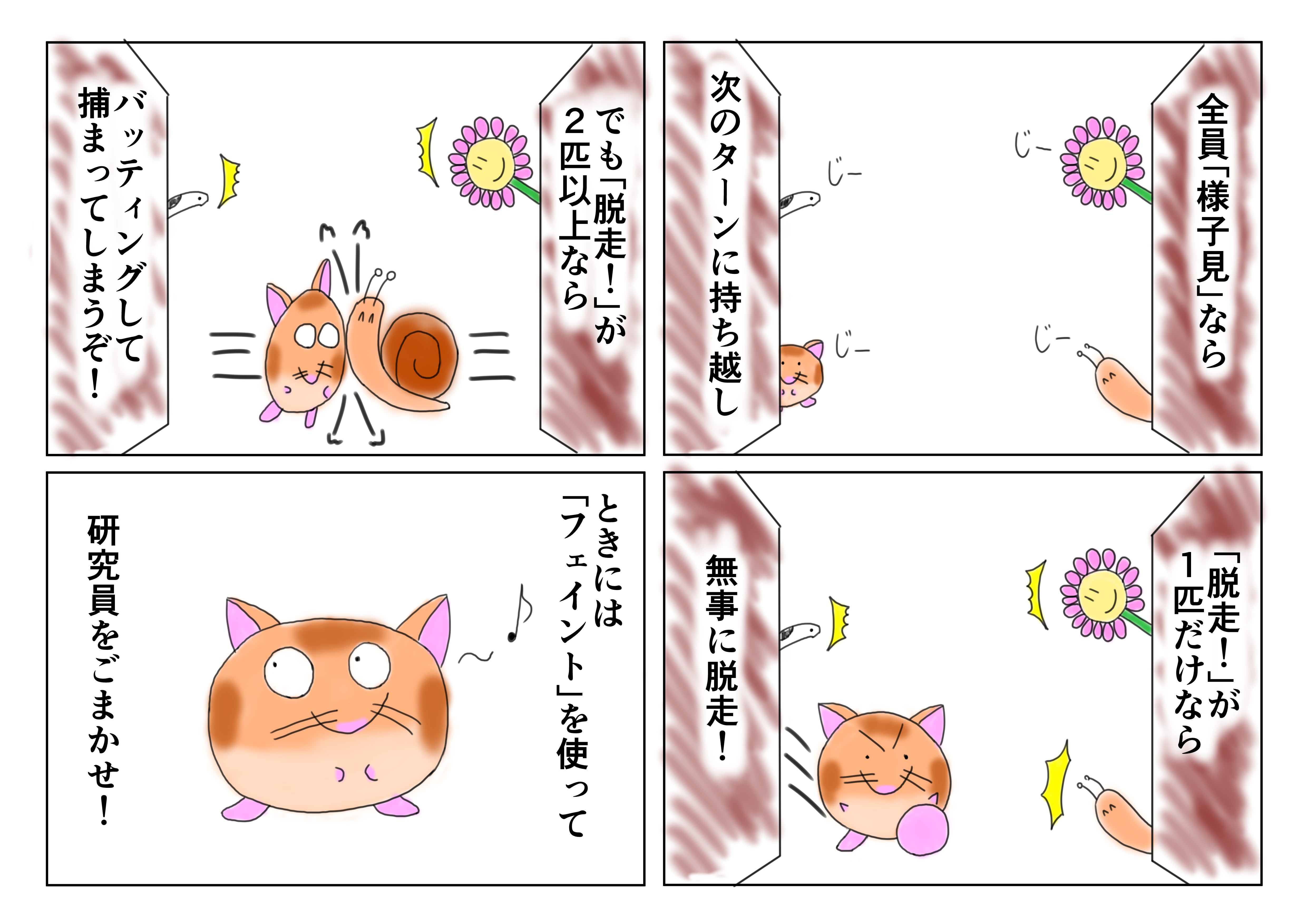 ・「脱走」と一緒に「フェイント」が出されていた場合、「脱走」を試みたプレイヤーは脱走に失敗してしまいます。この場合、「脱走」を出したプレイヤーが捕まり、ラウンドが終了します。