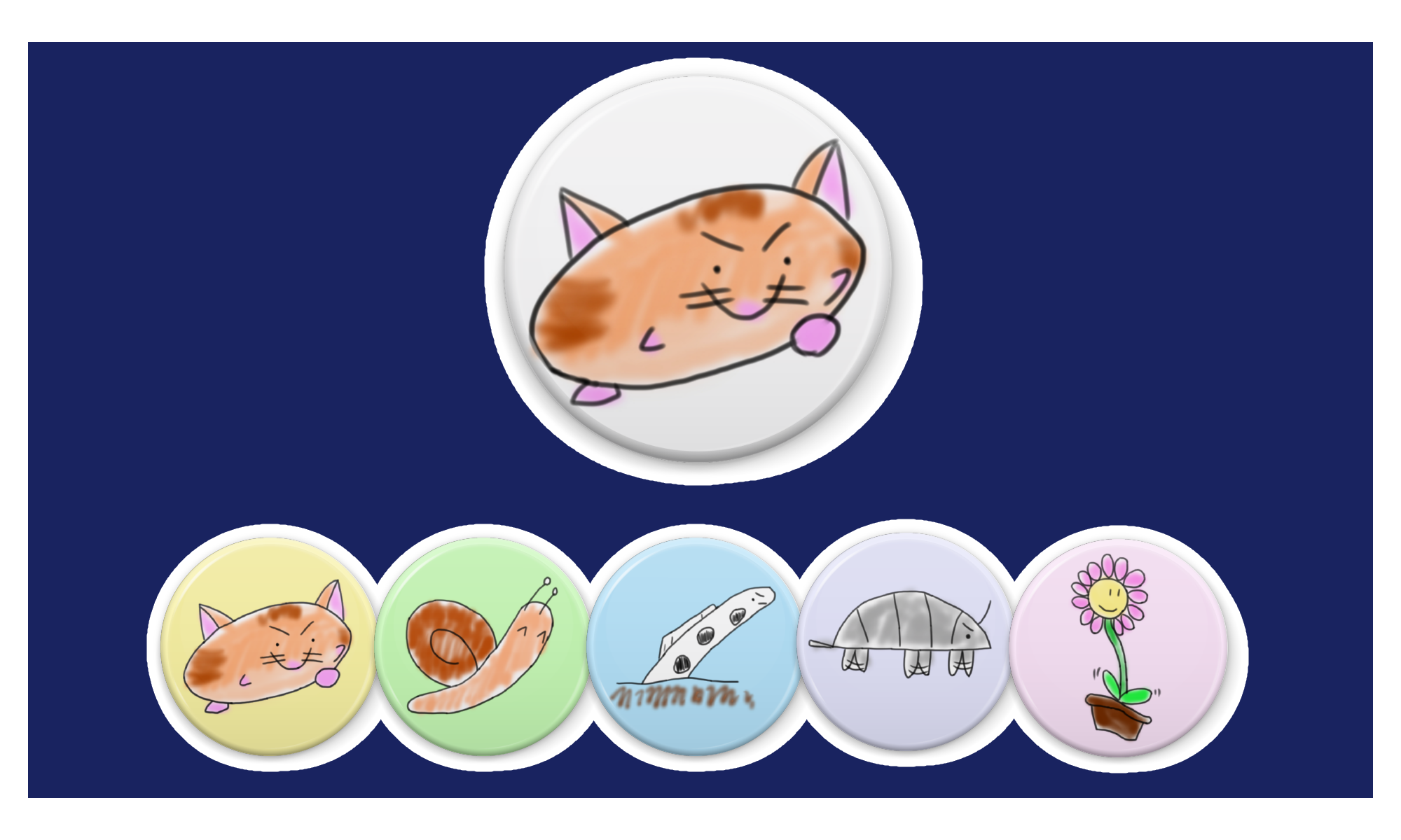 これはゲームに登場する5匹すべての生き物の缶バッジです。