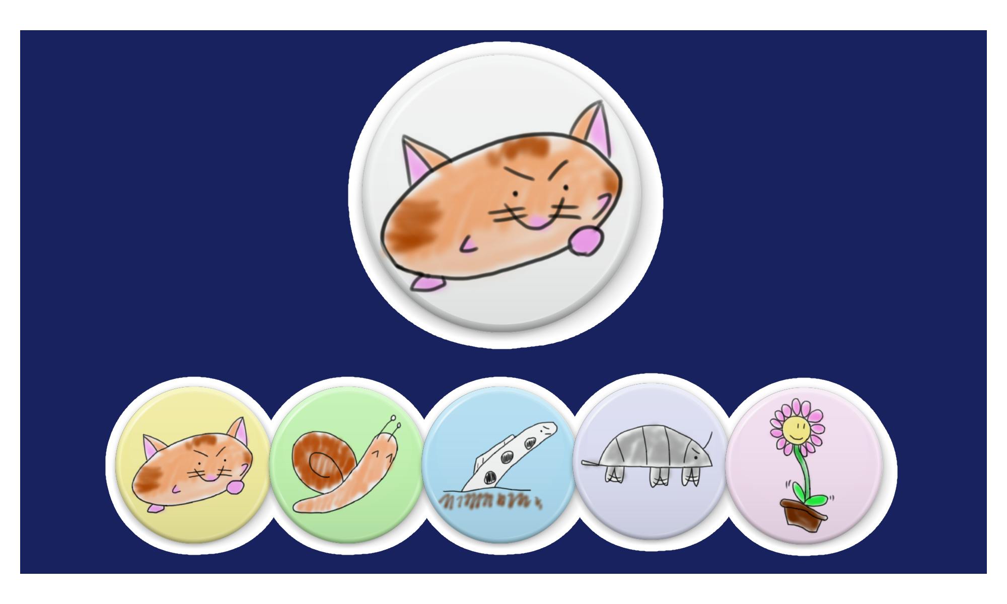 これはゲームに登場する5匹すべての生き物の缶バッジです。