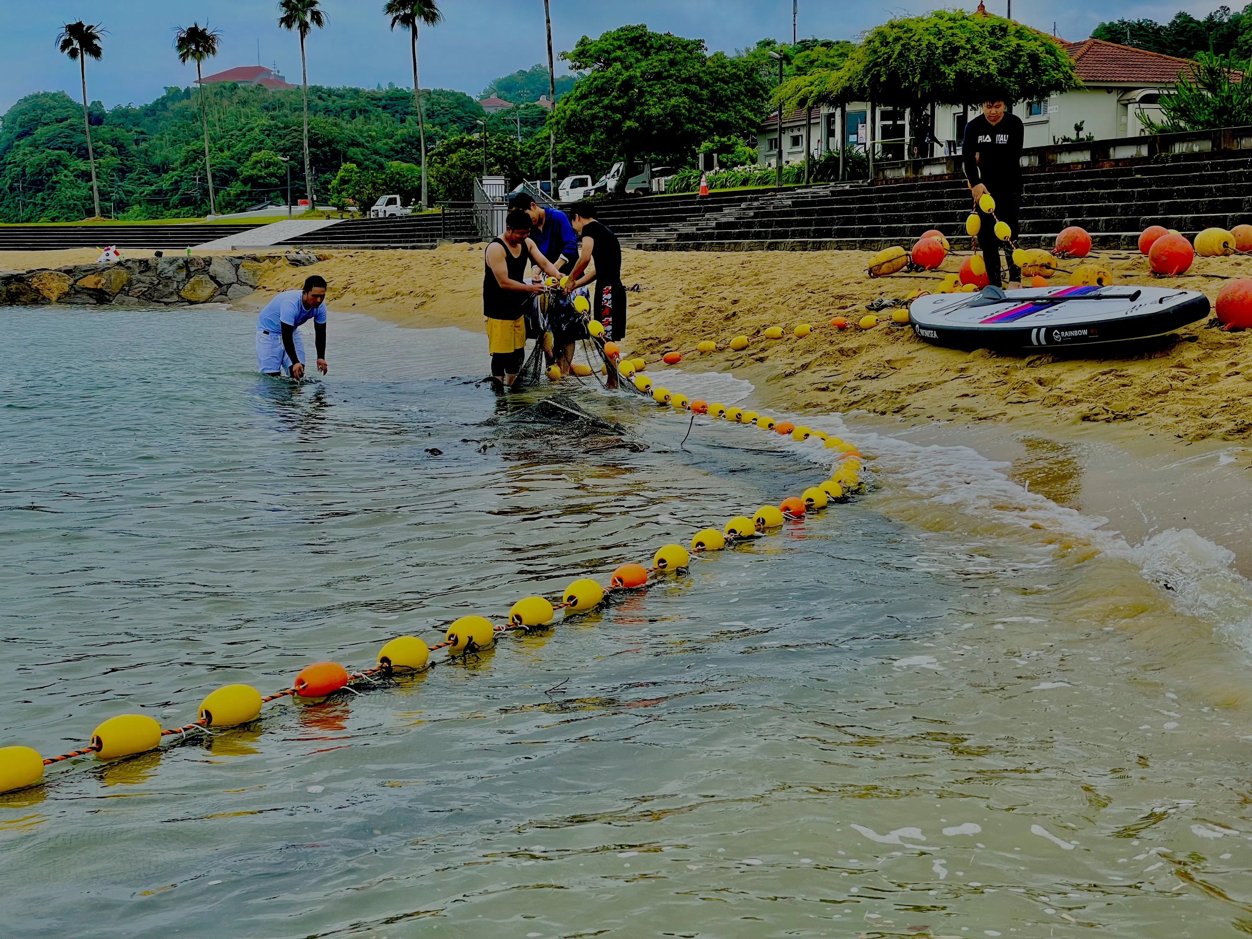 海上アスレチックによる事故の可能性も踏まえ、メーカーとも協議を重ねてきました。遊具の下にネットを増設することで、遊具の下へ潜り込まないように対策を行います。水深や設置場所によって変更できるため、満ち引きに合わせた移動を行うなど、安全対策にもしっかりと力を入れていきます。