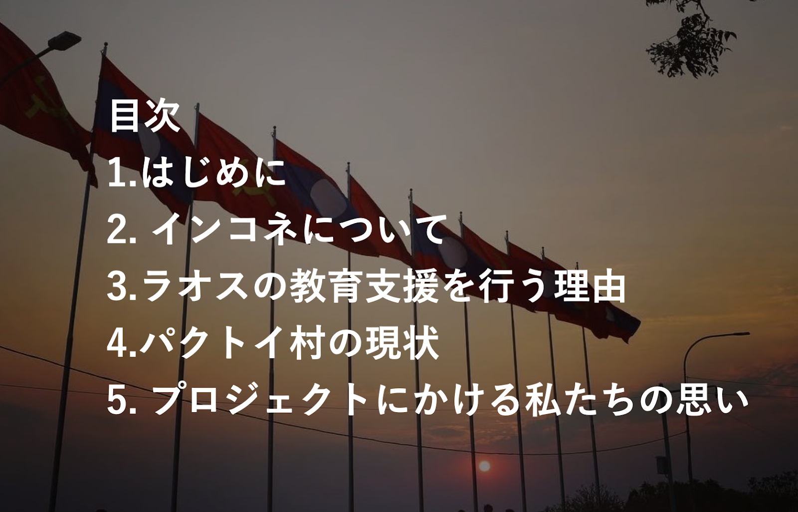 • こんにちは!8期共同代表の山元若菜です。インコネは現在、リターン履行に向けて着々と準備を進めております。さて今日は今後の学校建設に向けて、なくてはならない方々についてご紹介していきます!実は私たちインコネとラオスの間では、あるNGO団体が架け橋となり、様々なサポートをしてくださっています。それが【NGOクワトロ】という団体です。【NGOクワトロとは】NGOクワトロとはラオスをフィールドに、教育のインフラ整備教育に必要な経済力支援国内での支援従事者支援など、子どもの可能性を広げるため、様々な角度から支援をしています。インコネが3つ目の支援先を決定する際、ラオス教育局と相談し支援先候補をリストアップして下さったり、今回のプロジェクトが終了した後、ラオスの教育局と学校建設の契約を締結したりと、文字通り「架け橋」として、インコネの要となる活動を支援してくださっています。またNGOクワトロには、多くのインコネメンバーOBOGの方が所属していて、縦のつながりからも熱い応援をいただいています。【NGOクワトロ・インコネOGの方からメッセージ】そしてNGOクワトロメンバーであり、元インコネ副代表を務めた伴はるなさんからコメントをいただきましたので、紹介させていただきます!「NGOクワトロで教育支援事業の責任者をしております、伴です。2013年〜2015年の間インコネのメンバーとしてラオスの支援活動に携わり、その後OBメンバーと共にNGOクワトロとして学校建設支援や高校生の学生寮プロジェクトを実施しています。今の現役メンバーは、コロナ禍でラオスにも行けず、メンバーと対面で活動もできない中、パクトイ村に学校をつくること、そして子どもたちの未来に繋げることに対して、強い想いを持ち続けながら活動に励んでくれています。そんな彼らをいちOBとして誇りに思うと共に、このプロジェクトを通じて、パクトイ村の子どもたちがこの小学校で学び、沢山の卒業生がうまれていく未来を心から楽しみにしています。コロナ禍のクラウドファンディングのみならず、スタディーツアーやその他活動においても多くのご協力をしていただいています。」【最後に】私たちは、プロジェクト支援者の皆様のはもちろんのこと、本当にたくさんの応援のおかげで前進できていることを忘れず、次の第2歩目に進んでいきたいと思います!これからも進み続ける私たちインコネをよろしくお願いします。 もっと見る