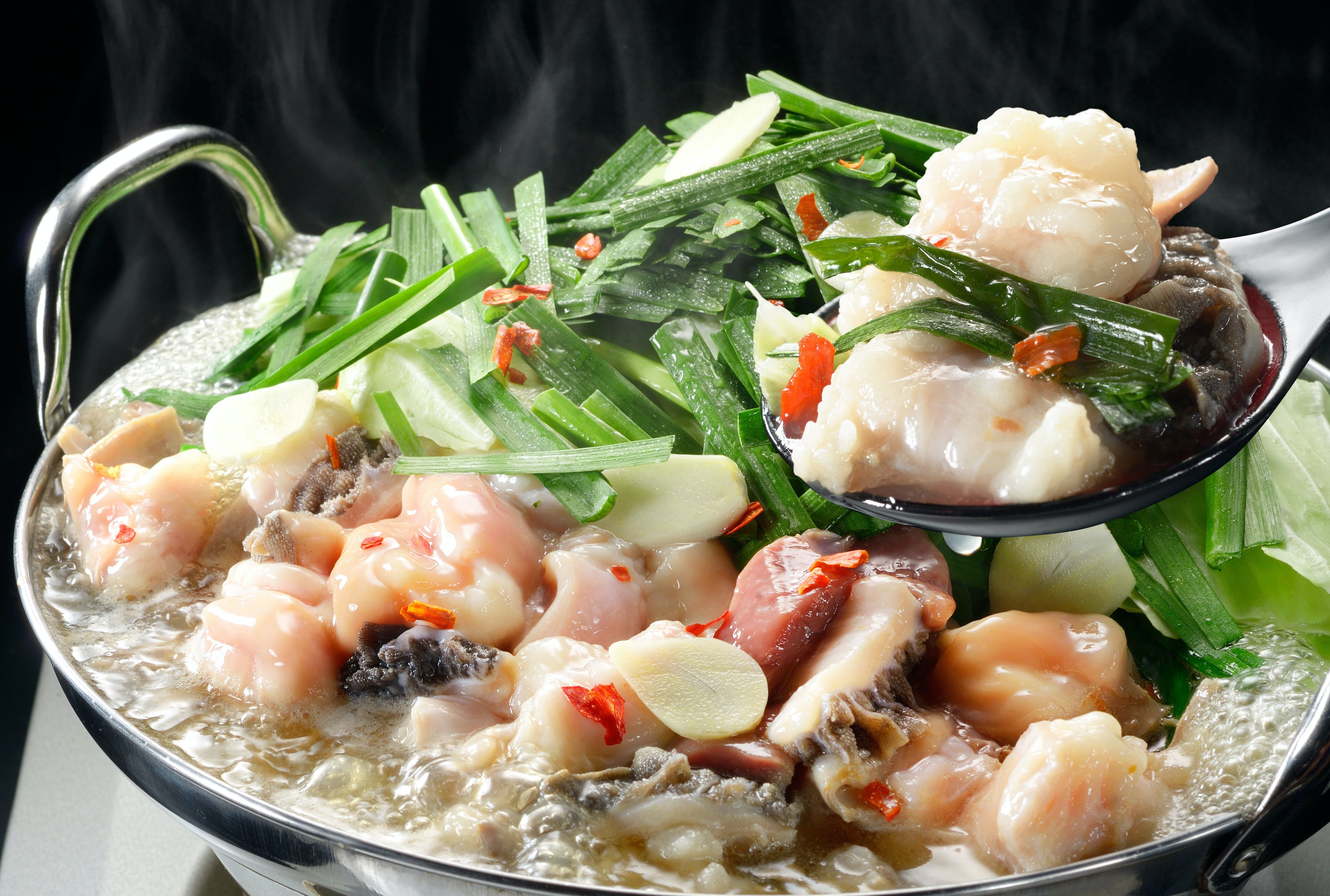 さばいたその日に瞬間冷凍したもつ肉は新鮮でぷりぷり!締めのちゃんぽん麺もついており、ボリュームたっぷり!