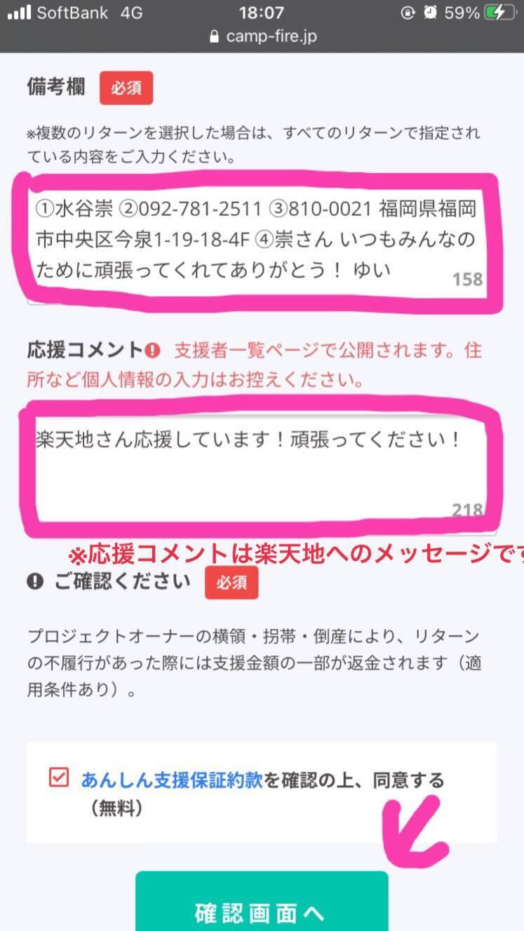 ・ご支援いただいた方には楽天地から感謝の気持ちのメッセージをお送りします。