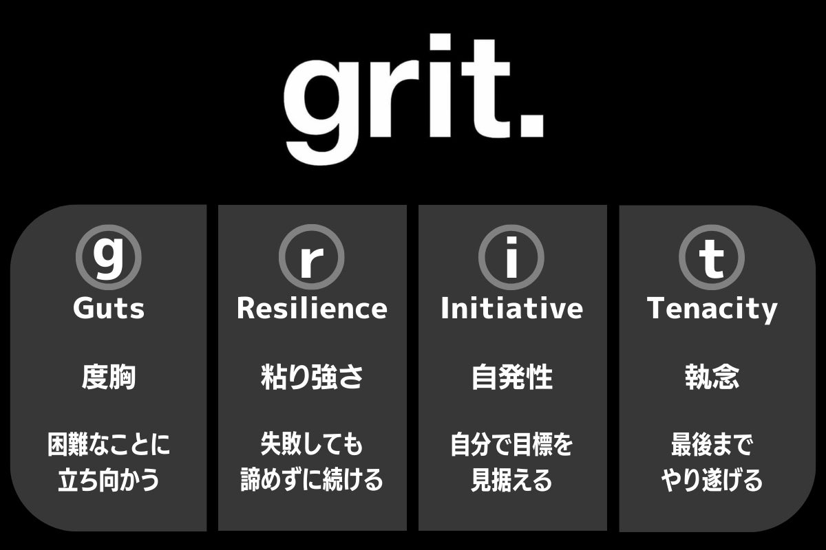 私のお店の店名である「grit.」は、困難なことにも立ち向かう「度胸(guts)」、失敗しても諦めずに続ける「粘り強さ(resilience)」、自分で目標を見据え「自発性(initiative)」、最後までやり遂げる「執念(tenacity)」これらの頭文字をとった言葉です。