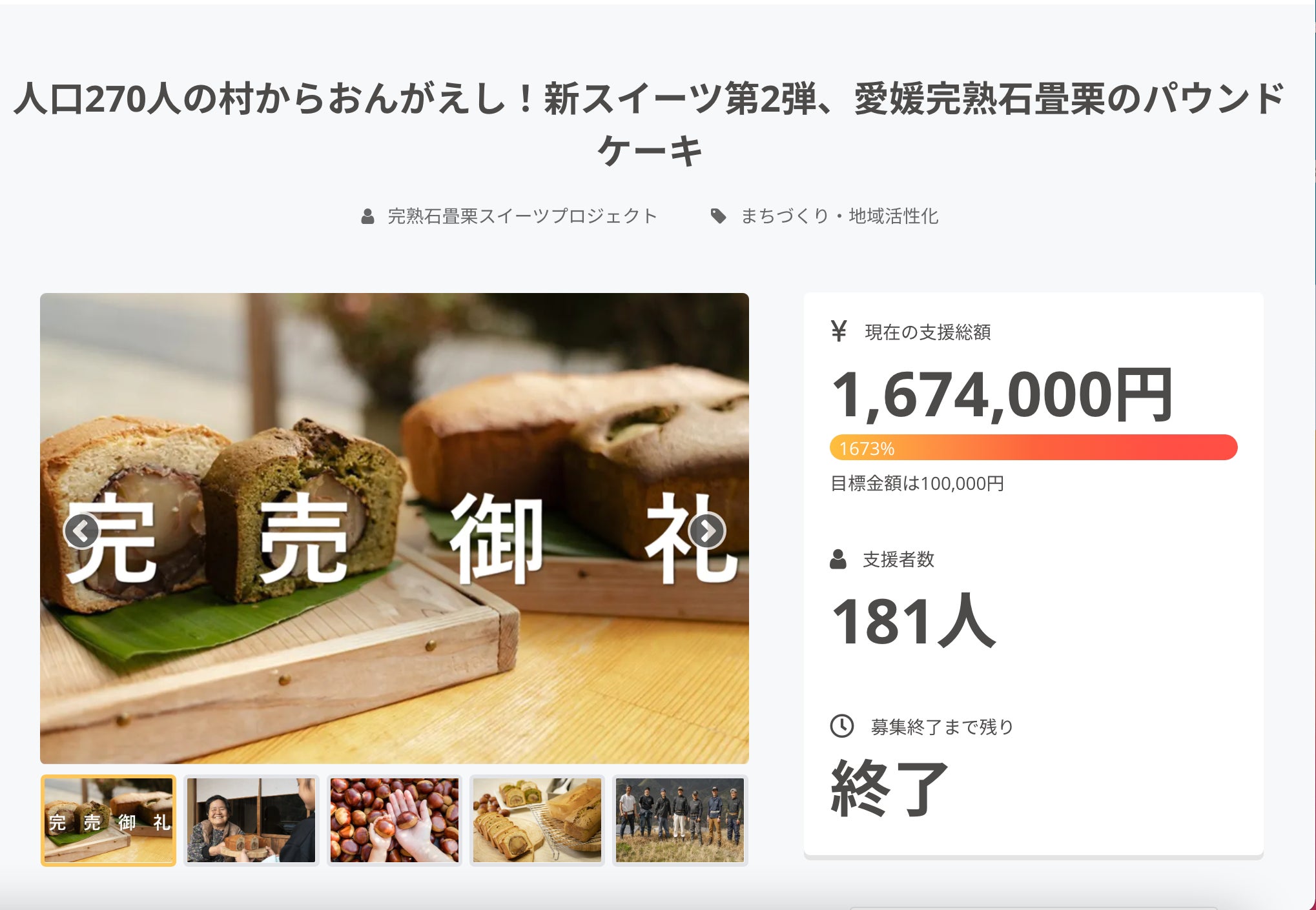 2021/07/09 22:37【つながる】今回もたくさんの「つながる」がありました!!みなさんこんばんは。橘洋二です。完熟石畳栗スイーツプロジェクトの第三弾のクラウドファンディングが終了致しました。第三弾の今回も多数の方々からご支援頂きました!本当にありがとうございます。これから私たちは製造に移ってまいります。栗農家さん達がまごころ込めて作った栗を、パティシエ達が魂込めてスイーツへと姿を変えていく。「つながる」という事を意識せずにはいられません。石畳栗農家さん達と出会った私たち橘三兄弟も「つながる」、そして、ご支援頂きましたみなさんとも「つながる」どこまで「つながる」は続いていくのでしょう。今回のクラウドファンディングでは、東京都世田谷区のカフェジョルジュさんと「つながる」があり、栗ラボ第一支部として活動してくれるようになりました。みなさん、感謝してます。これからの「つながる」にわくわくしながら第三弾クラウドファンディングのお礼に変えさせて頂きます。だんだん。(愛媛松山の方言でありがとうの意)三日月とカフェ 橘 洋二※【結果】目標:300,000円実績:1,504,000円支援者:167名 もっと見る