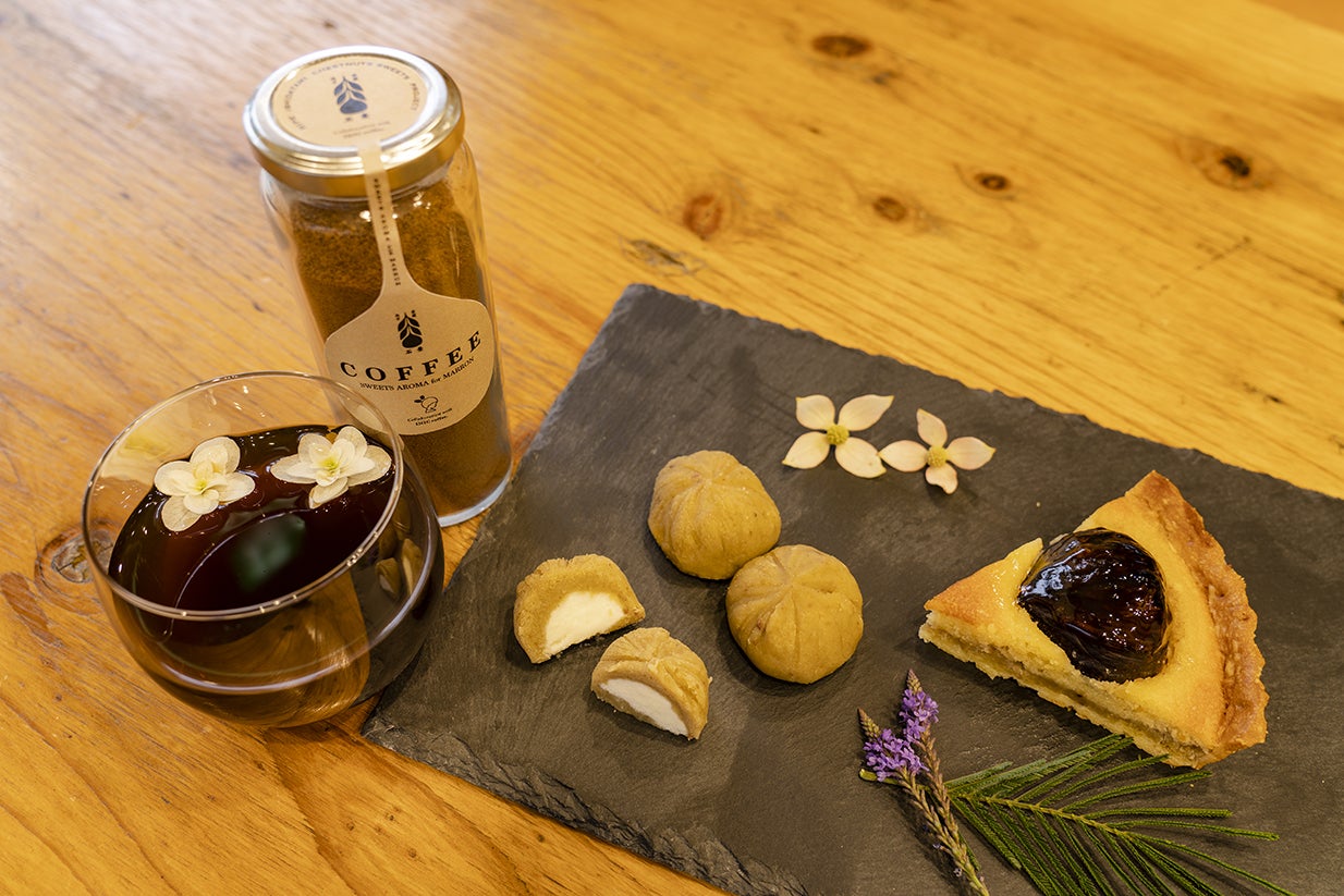 まず栗の風味を先に感じ、コーヒーのビターな風味がマッチして後味をつくる。お互いに邪魔をせず、強みで補い合う関係。そよ風そそぐ自然あふれる田舎道を、手を繋いでのんびりと歩いているような、そんなマリアージュをお楽しみいただけます。
