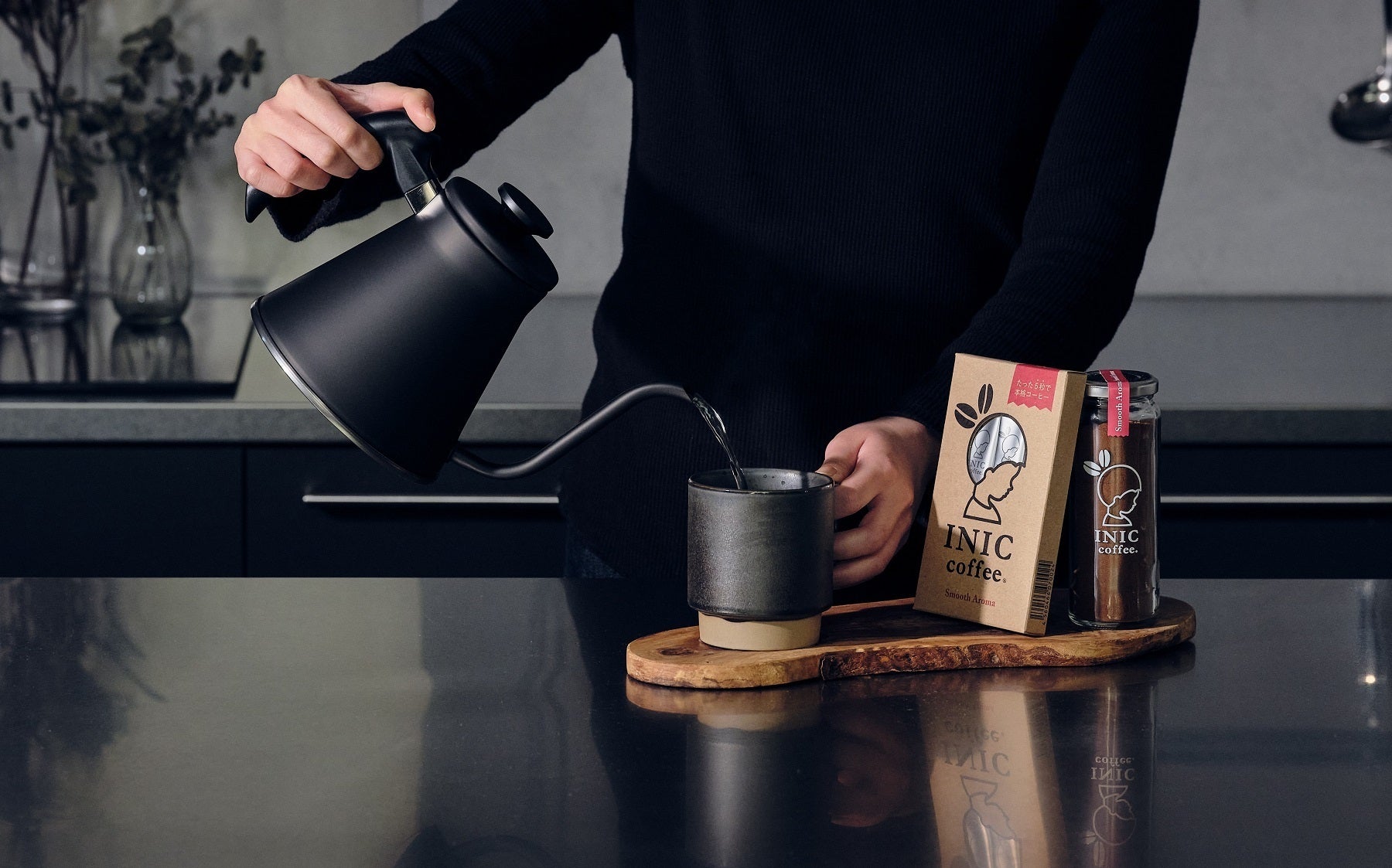 INICコーヒーはお湯やお水を注ぐだけで、5秒で本格コーヒーが味わえます。