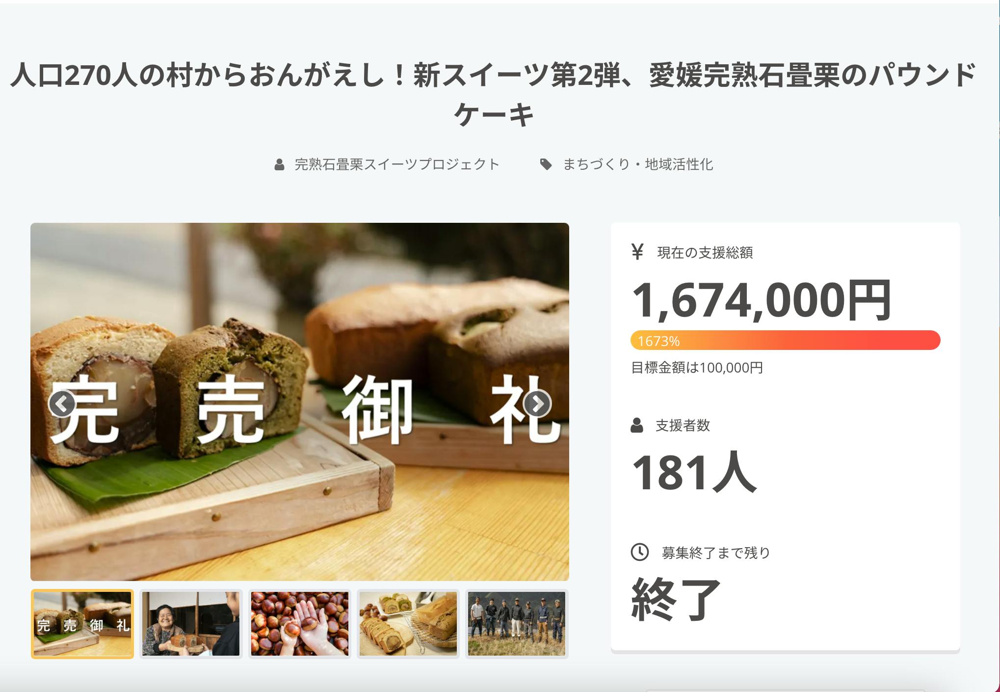 2021/07/09 22:37【つながる】今回もたくさんの「つながる」がありました!!みなさんこんばんは。橘洋二です。完熟石畳栗スイーツプロジェクトの第三弾のクラウドファンディングが終了致しました。第三弾の今回も多数の方々からご支援頂きました!本当にありがとうございます。これから私たちは製造に移ってまいります。栗農家さん達がまごころ込めて作った栗を、パティシエ達が魂込めてスイーツへと姿を変えていく。「つながる」という事を意識せずにはいられません。石畳栗農家さん達と出会った私たち橘三兄弟も「つながる」、そして、ご支援頂きましたみなさんとも「つながる」どこまで「つながる」は続いていくのでしょう。今回のクラウドファンディングでは、東京都世田谷区のカフェジョルジュさんと「つながる」があり、栗ラボ第一支部として活動してくれるようになりました。みなさん、感謝してます。これからの「つながる」にわくわくしながら第三弾クラウドファンディングのお礼に変えさせて頂きます。だんだん。(愛媛松山の方言でありがとうの意)三日月とカフェ 橘 洋二※【結果】目標:300,000円実績:1,504,000円支援者:167名 もっと見る