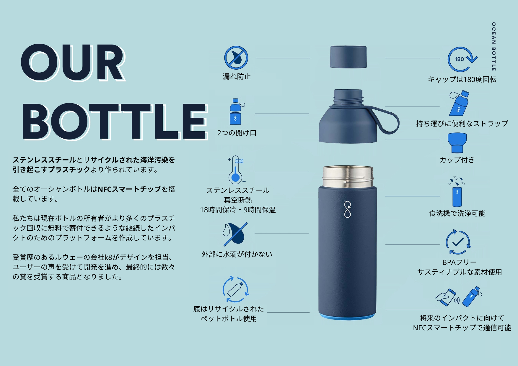 オーシャンボトルはあなたが購入する最後の繰り返し使用可能なボトルとなるよう設計されています。私たちは受賞歴のあるノルウェーのデザイン会社K8とパートナーを組み、存在する様々な革新的な機能を備えた最高の機能を持つ500mlのボトルを作りました。