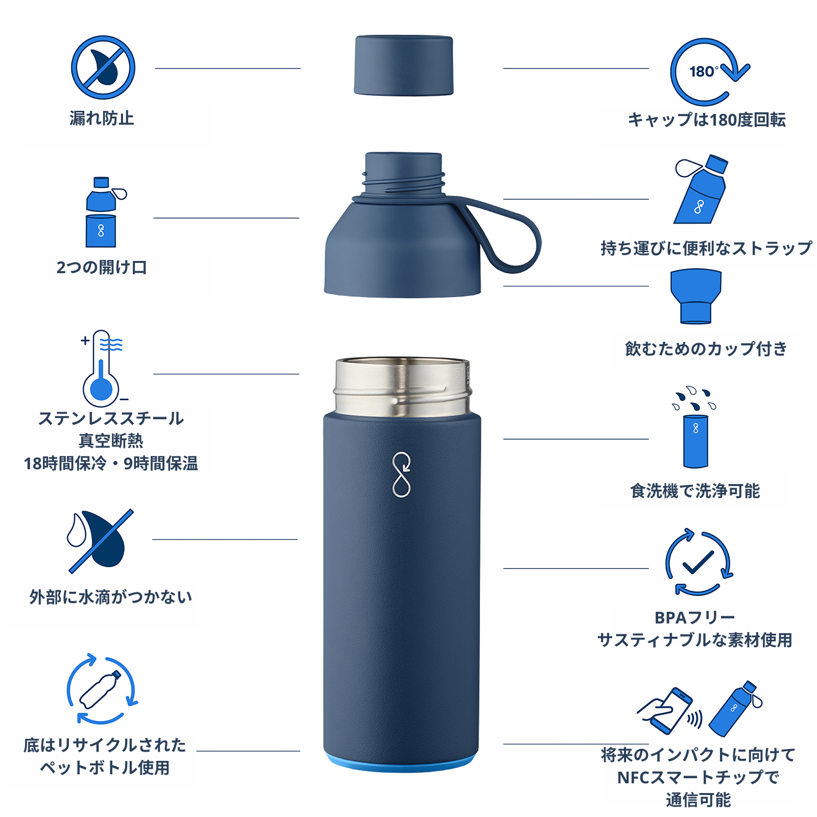 数々の賞を受賞したオーシャンボトルは、一つで1000本のペットボトルを回収する基金を集めることができます。冷たい飲みものは冷たいまま、熱いものは熱いまま保管することができます。二重層からなる真空断熱のステンレススチールとリサイクル素材よりできています。液体漏れ防止の二つの開け口により、簡単に飲み物が入れられ掃除も楽にできます。また、他の繰り返し利用が可能な水筒と異なり、オーシャンボトルは食器洗浄機に対応しています。