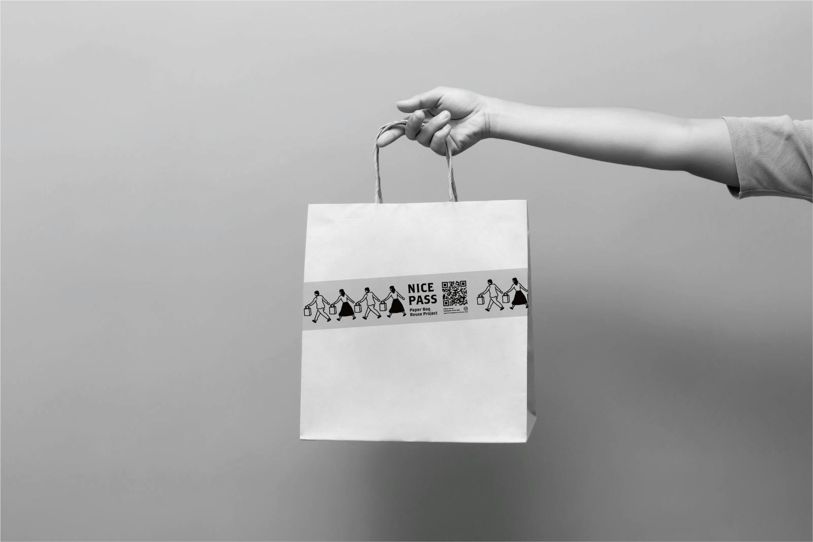 ナイスパスのシールを貼ったショッパーを持つ、ナイスパスに袋を提供することが、かっこいいことに。