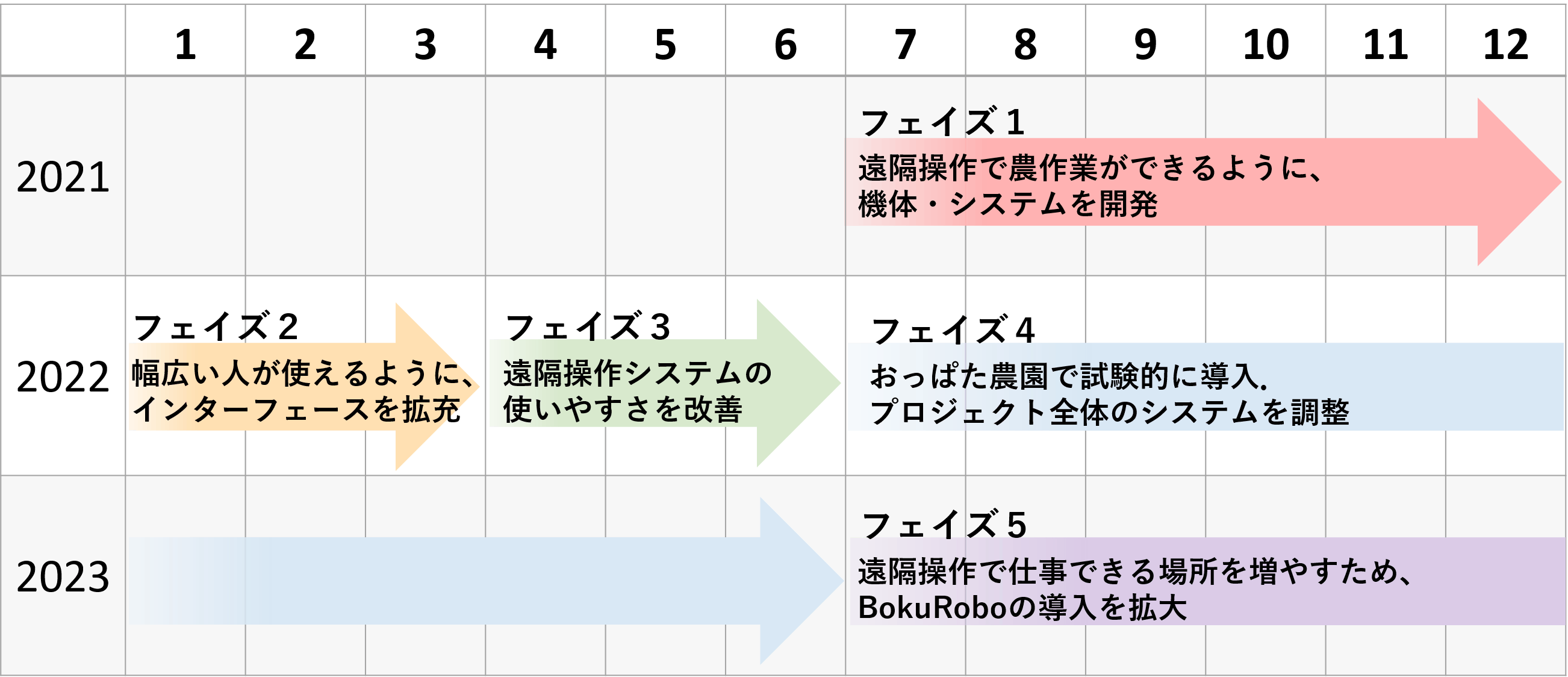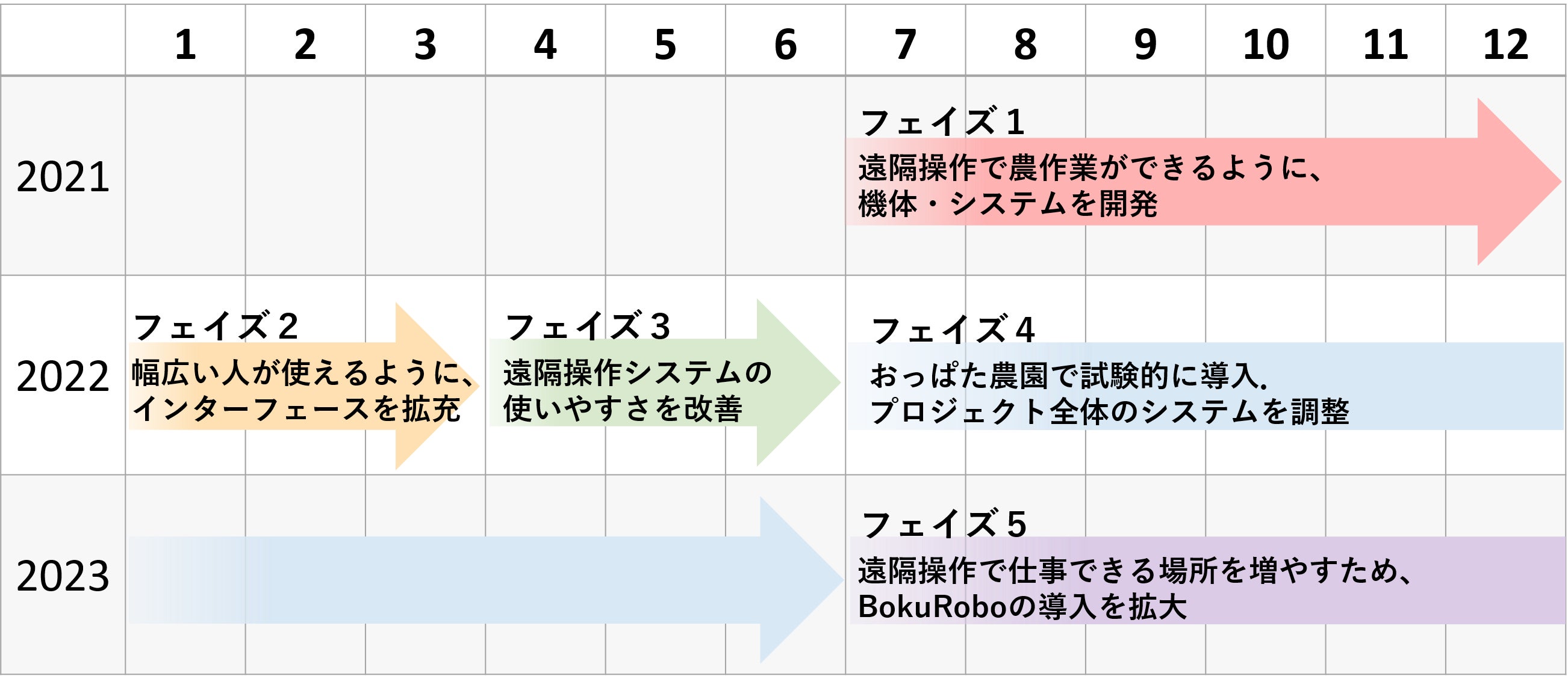 そして、おっぱた農園で試験的に導入しプロジェクト全体のシステムの調整をした後、このプロジェクトに共感していただけるパートナー農園でもBokuRoboを導入していただけるように環境を整えていきたいと考えています。『フェイズ:段階』