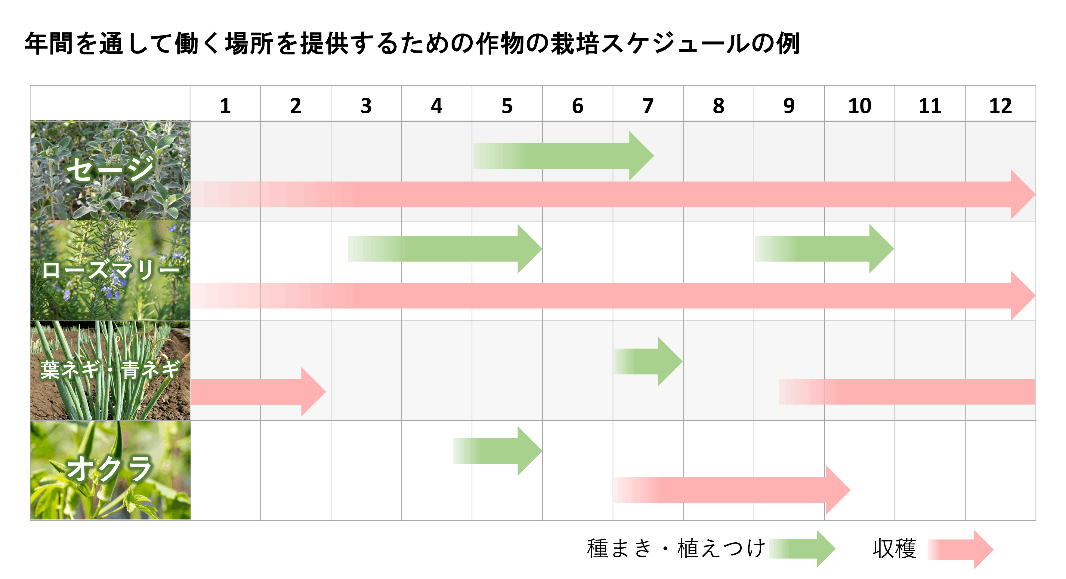 また、働く意欲のある障がい者・高齢者に年間を通して働く場所を提供するためにも、年間を通して農作業ができるように作物の栽培スケジュールを組む必要があります。上記の作物でスケジュールを組んだ場合、以下のような栽培スケジュールになります。