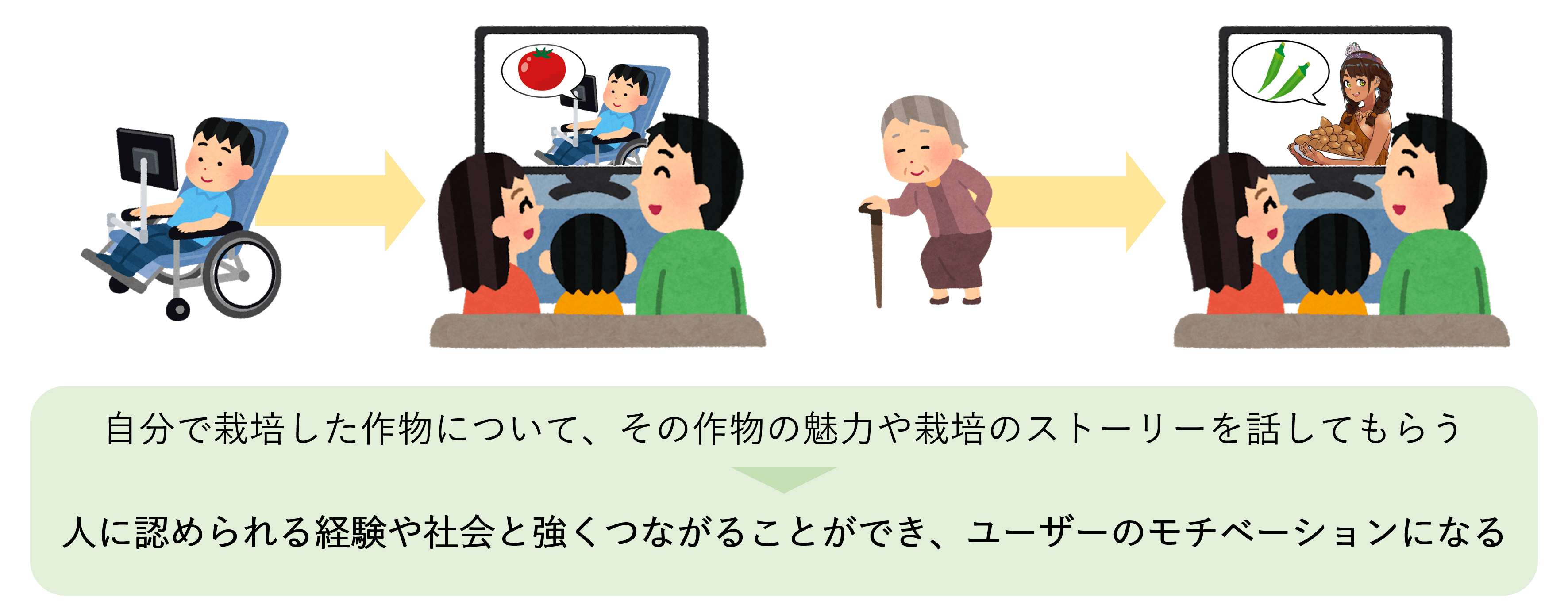 加えて、障がい者・高齢者に自分が栽培した作物について、その作物の魅力や栽培のストーリーを説明し、生活者に販売する機会も作りたいと考えています。人に自分の頑張りを発表する機会も設けることで、人に仕事を評価してもらえたり、社会と強くつながる経験ができ、ユーザーのモチベーションアップにつながると考えています。