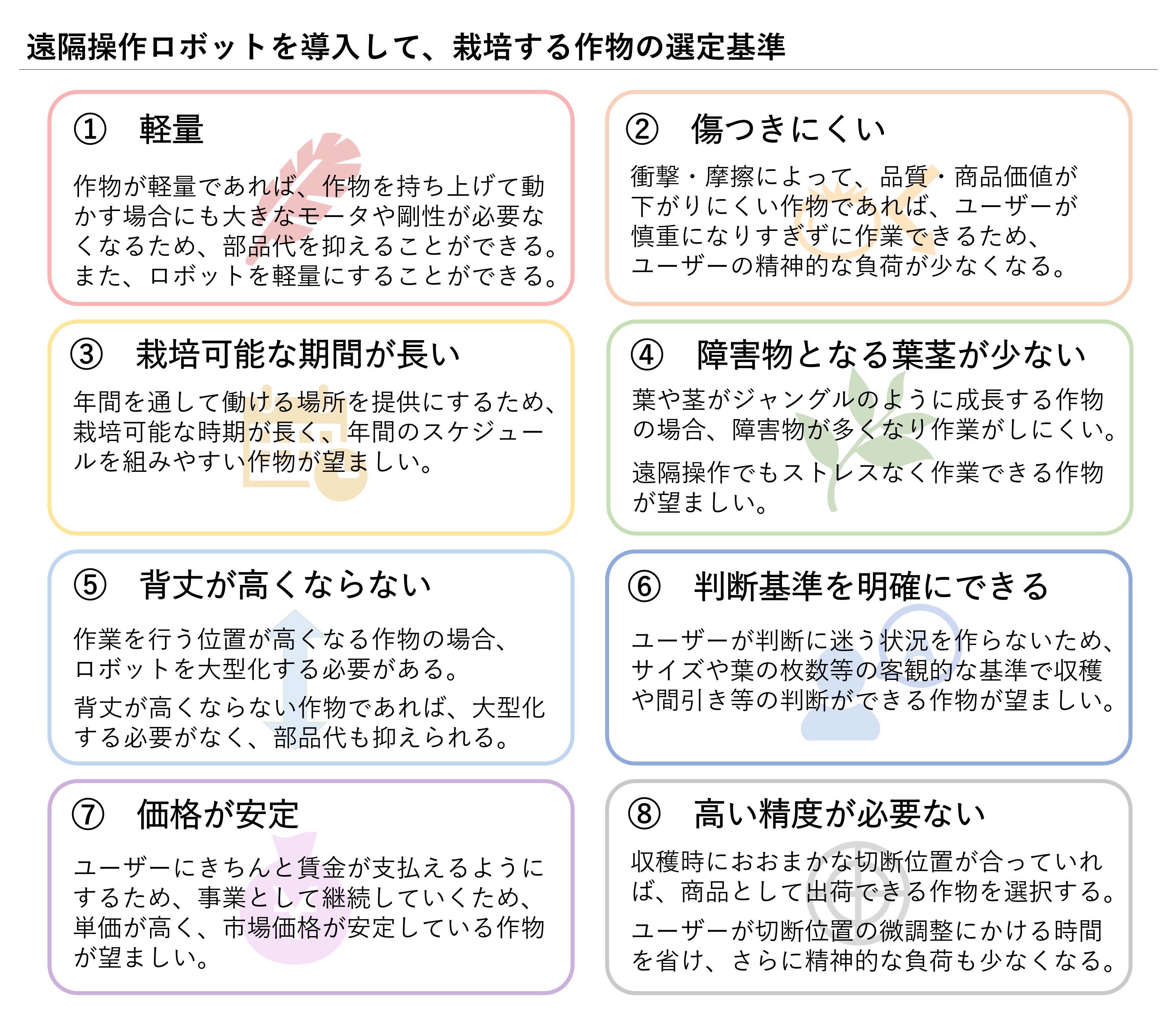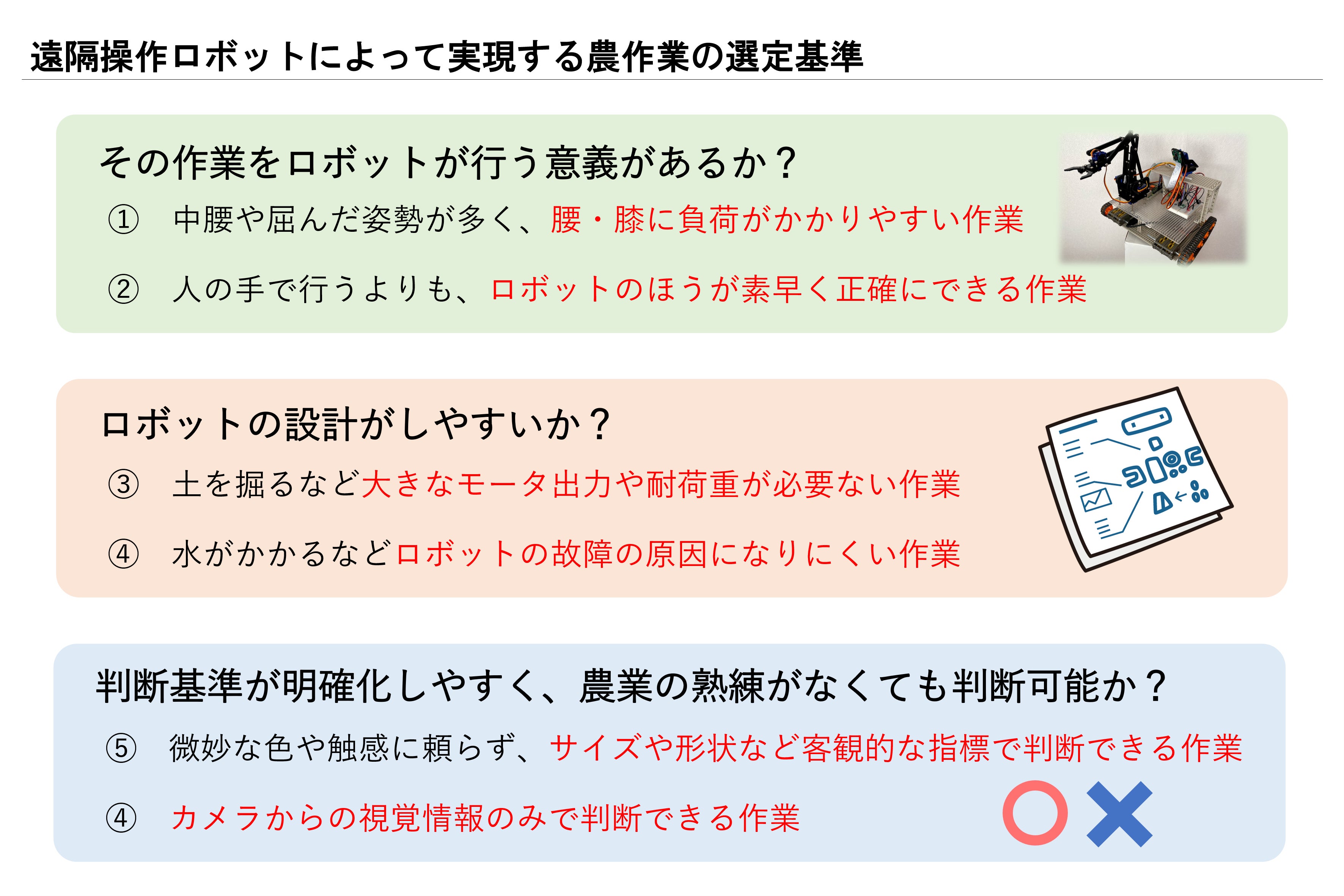 遠隔操作ロボットによって実現する農作業の選定基準は以下のように考えています。