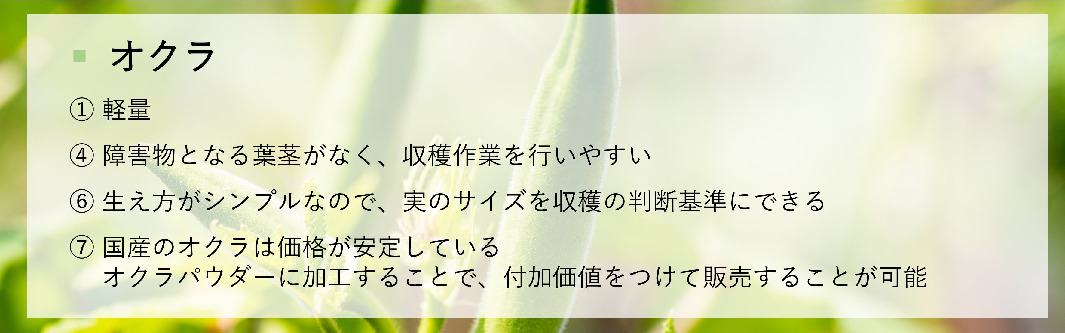選定基準を考慮し、多くの条件を満たしている『ハーブ類』『葉ネギ・青ネギ』『オクラ』を栽培しようと考えています。