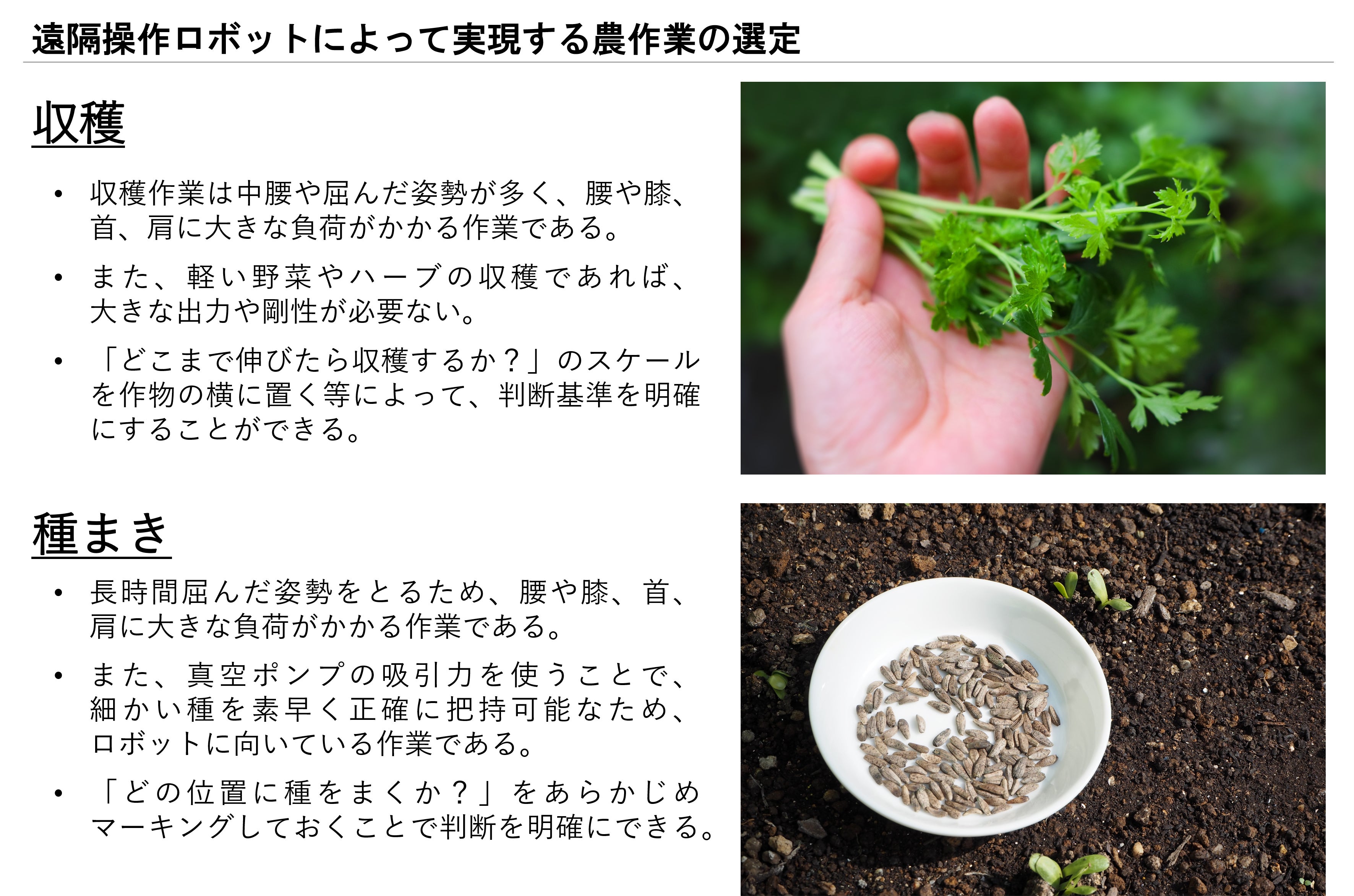上記の選考基準から、遠隔操作ロボットで行う農作業として、『収穫』『種まき』 『草刈り・間引き』 『剪定・芽かき』が向いていると考えます。