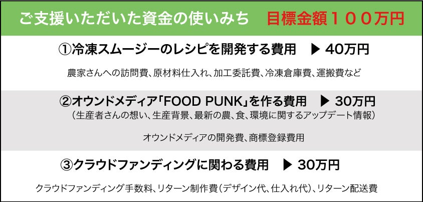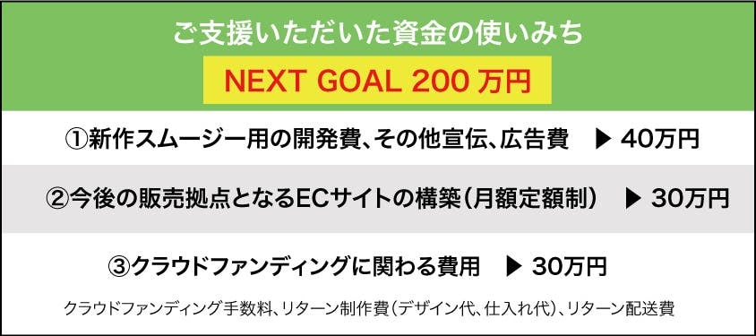 現在、CHISO-馳走-のスムージーは今回リターンでご用意している「THE ONE」の1種類しかありません。今後サブスクリプションモデルのD2Cブランド(店舗を構えず、ECサイトのみで月額定額制で販売させていただくこと)として毎日気分に合わせスムージーを選んでいただけるように、あと3種類のスムージーを開発し、ECサイトで販売する予定です。その為に必要な開発費用とECサイト構築費に使わせていただきます。