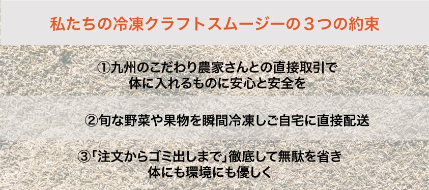 私達の冷凍クラフトスムージーは今までの冷凍食品をイメージを一掃します。材料はすべて顔の見える農家さんが有機栽培や無農薬、減農薬で愛情込めて作る、よりクリーンでオーガニックな野菜や果物を使います。収穫後は新鮮なまま洗浄、カットし瞬間冷凍することで栄養価と鮮度を保ったまま長期保存が可能になりました。