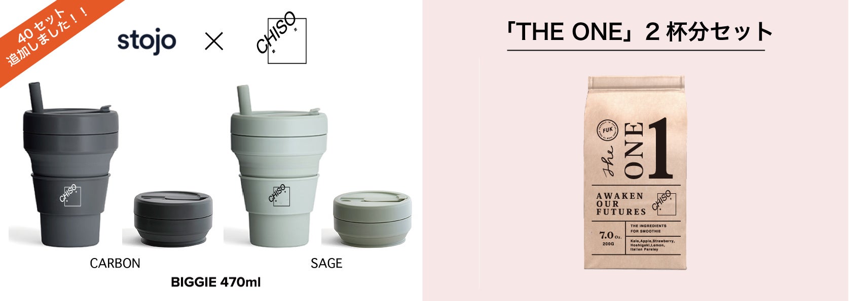 追加のリターンは「stojo × CHISO-馳走-」のコラボカップと「THE ONE」2杯分セットです。