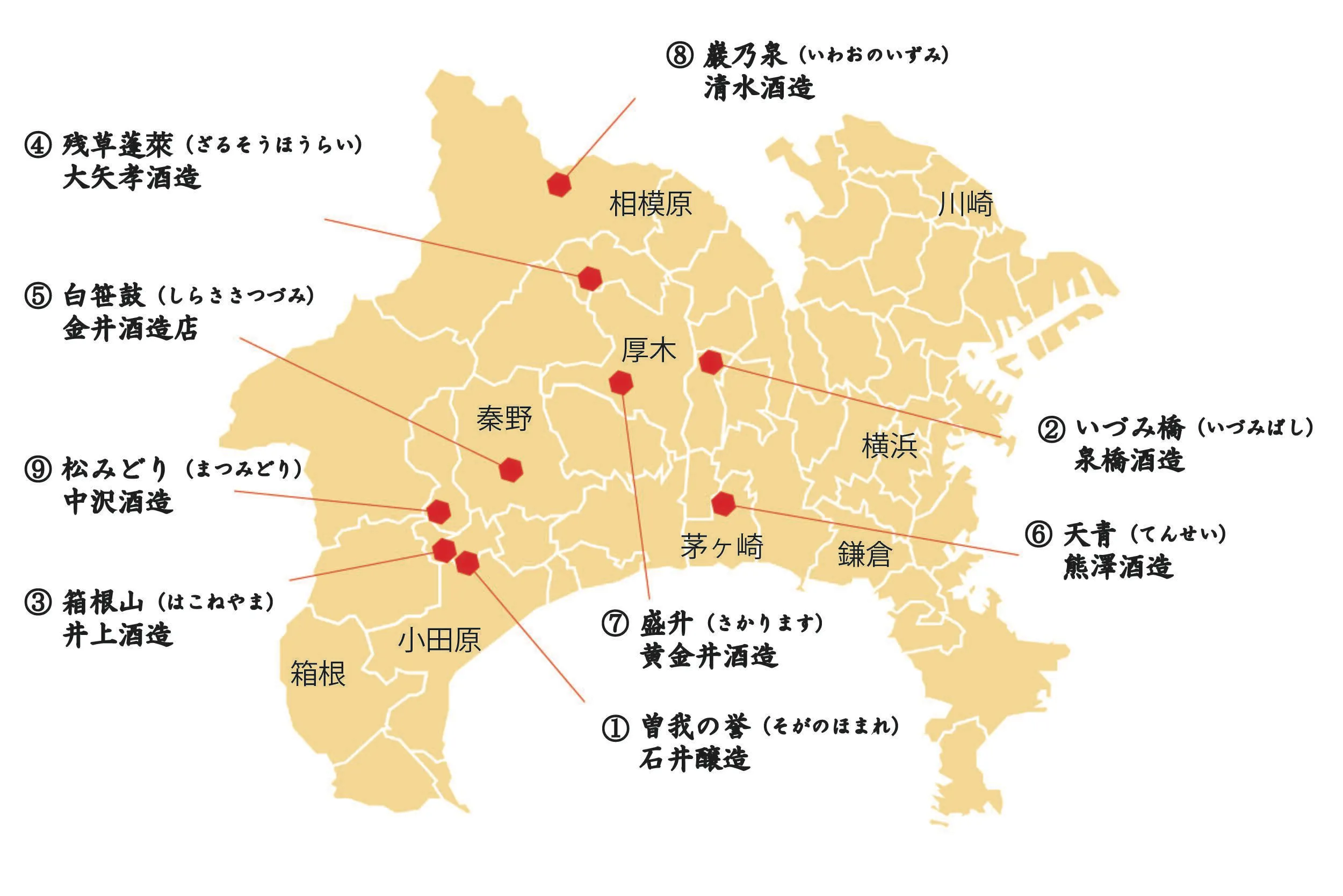 神奈川県は、食の大消費地である横浜があり、また東京にも隣接していることから、昔から清酒造りは盛んでした。しかし、時代の流れにより、 神奈川県内の数百あった酒蔵も、選りすぐりの13蔵が残るのみになりました。